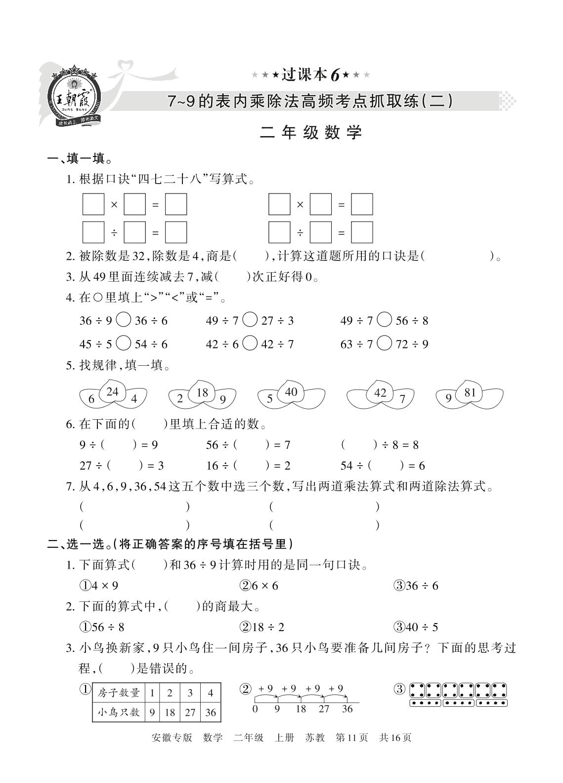 王朝霞期末过课本——7~9的表内乘除法高频考点抓取练(二)二年级上册数学(苏教版)【6】
