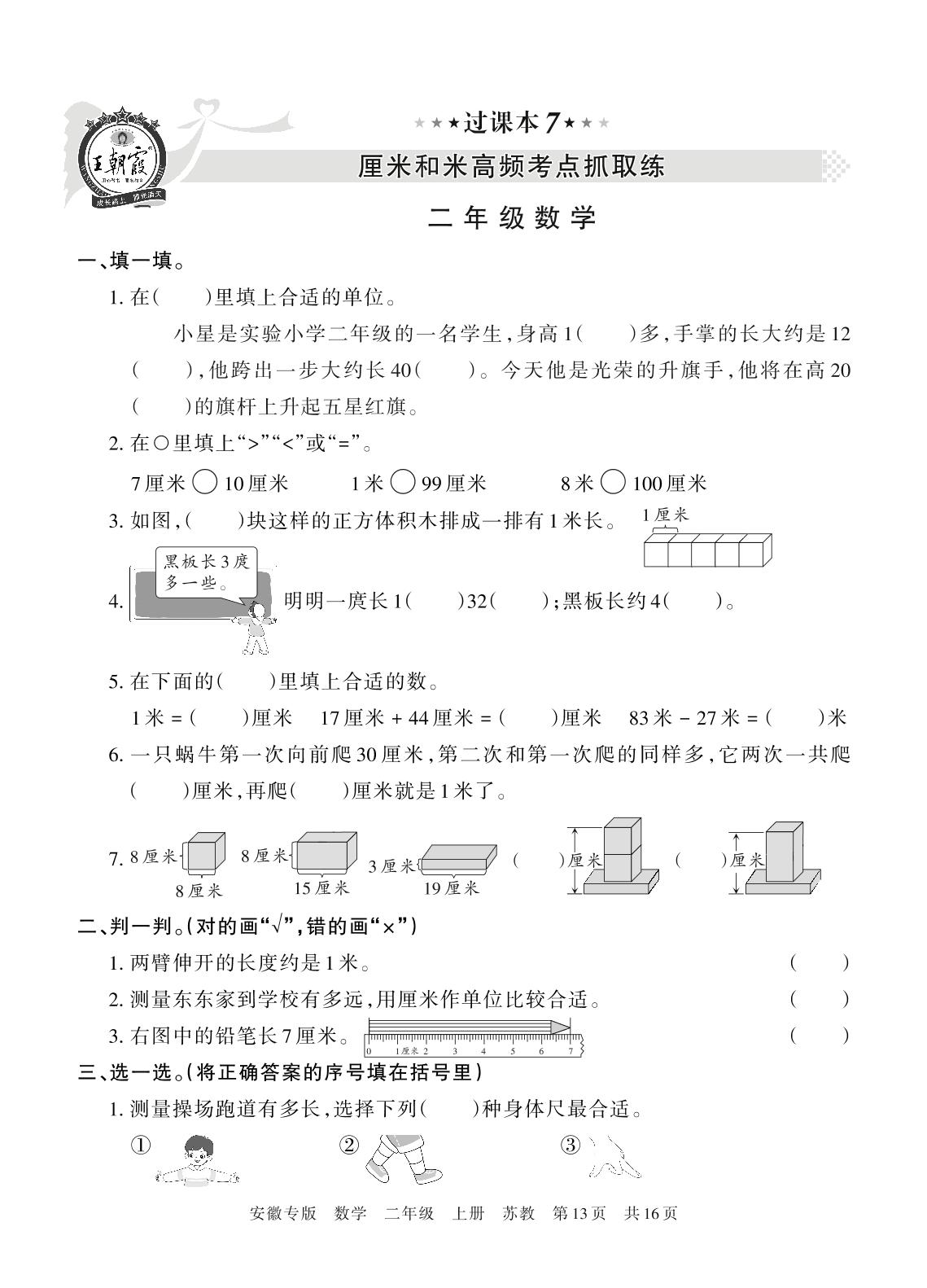 王朝霞期末过课本——厘米和米高频考点抓取练二年级上册数学(苏教版)【7】