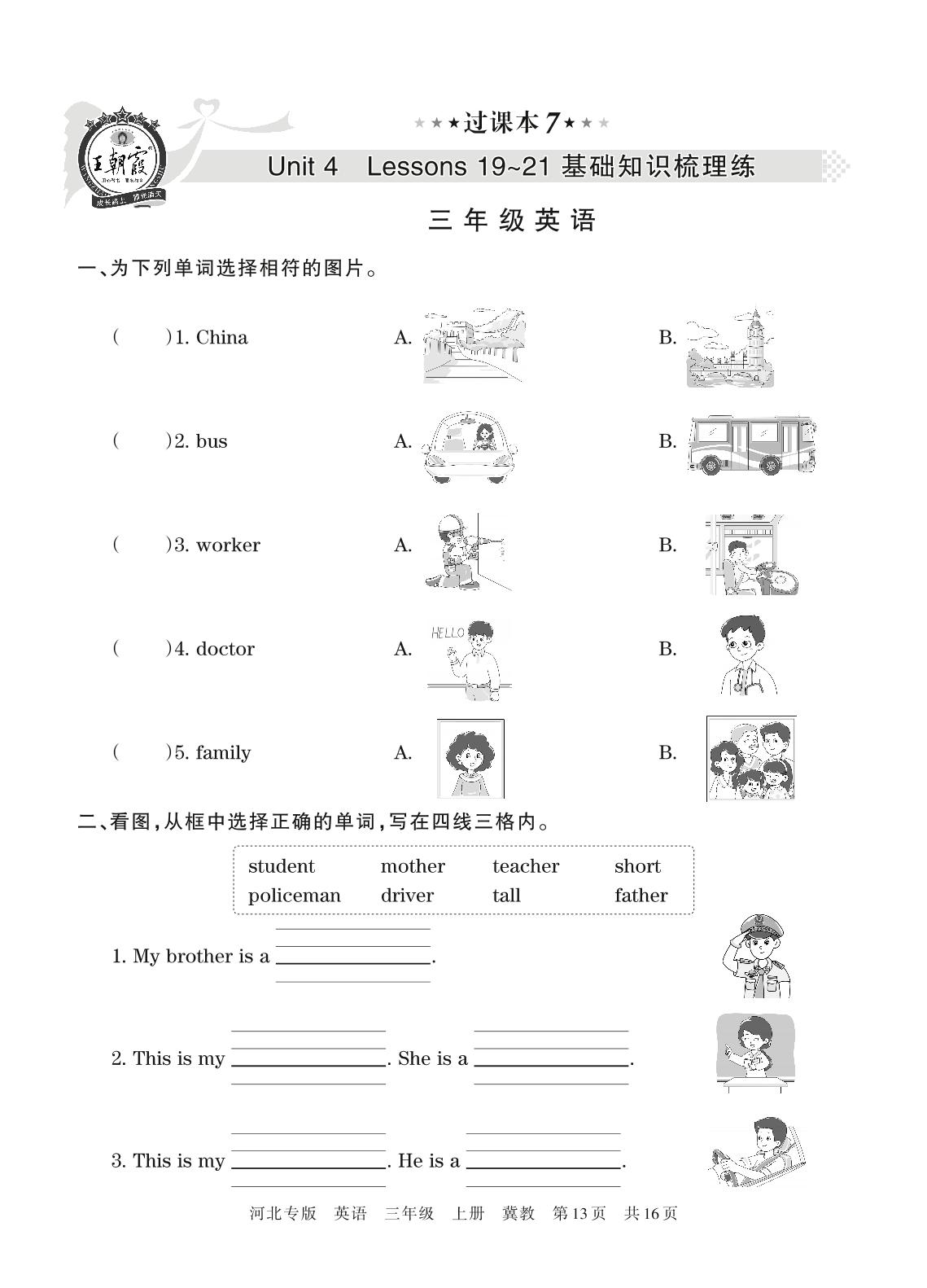 王朝霞期末过课本——Unit 4 Lessons 19~21 基础知识梳理练三年级上册英语(冀教版)【7】