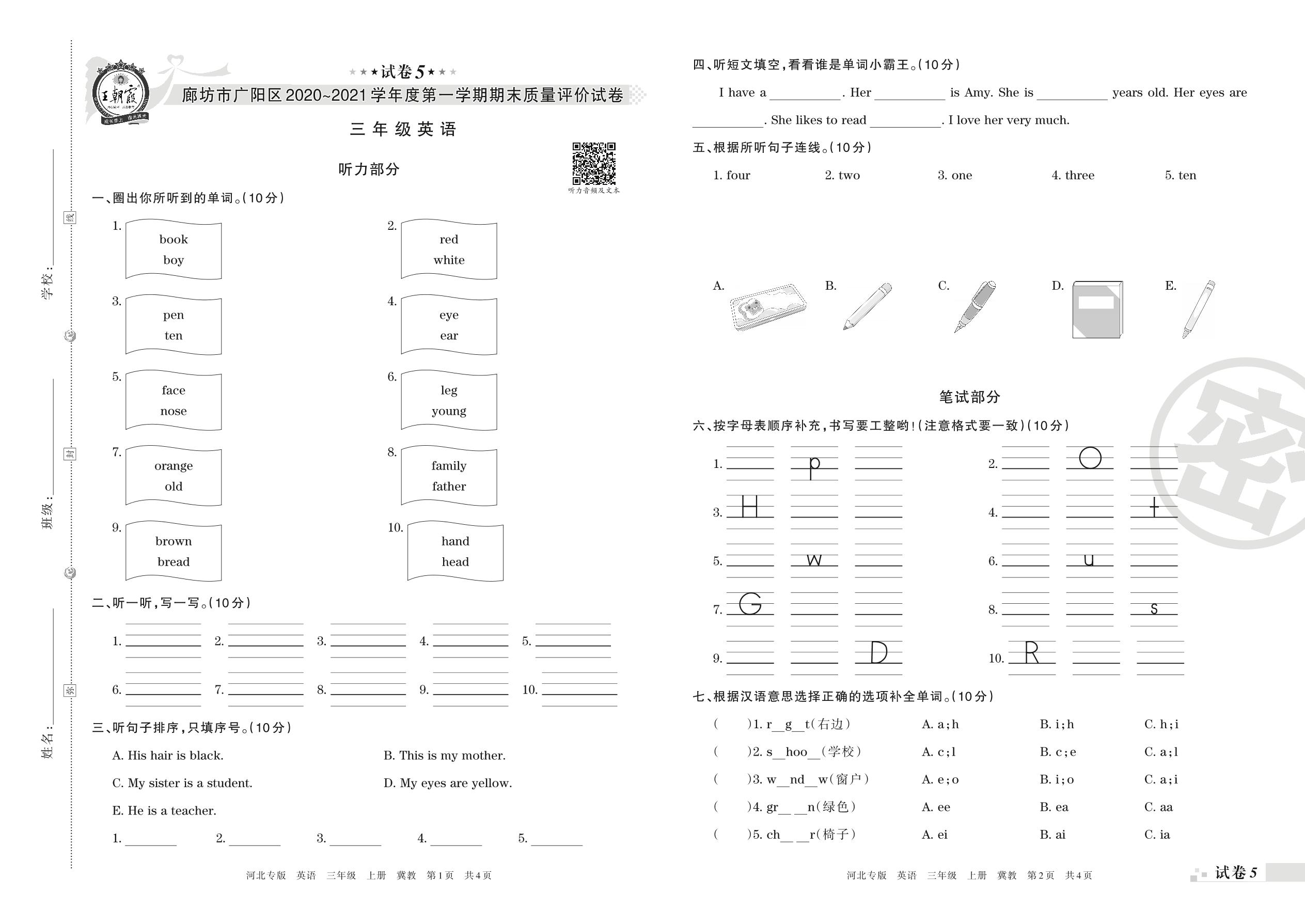 廊坊市广阳区2020~2021学年度第一学期期末质量评价试卷三年级上册英语(冀教版)【5】