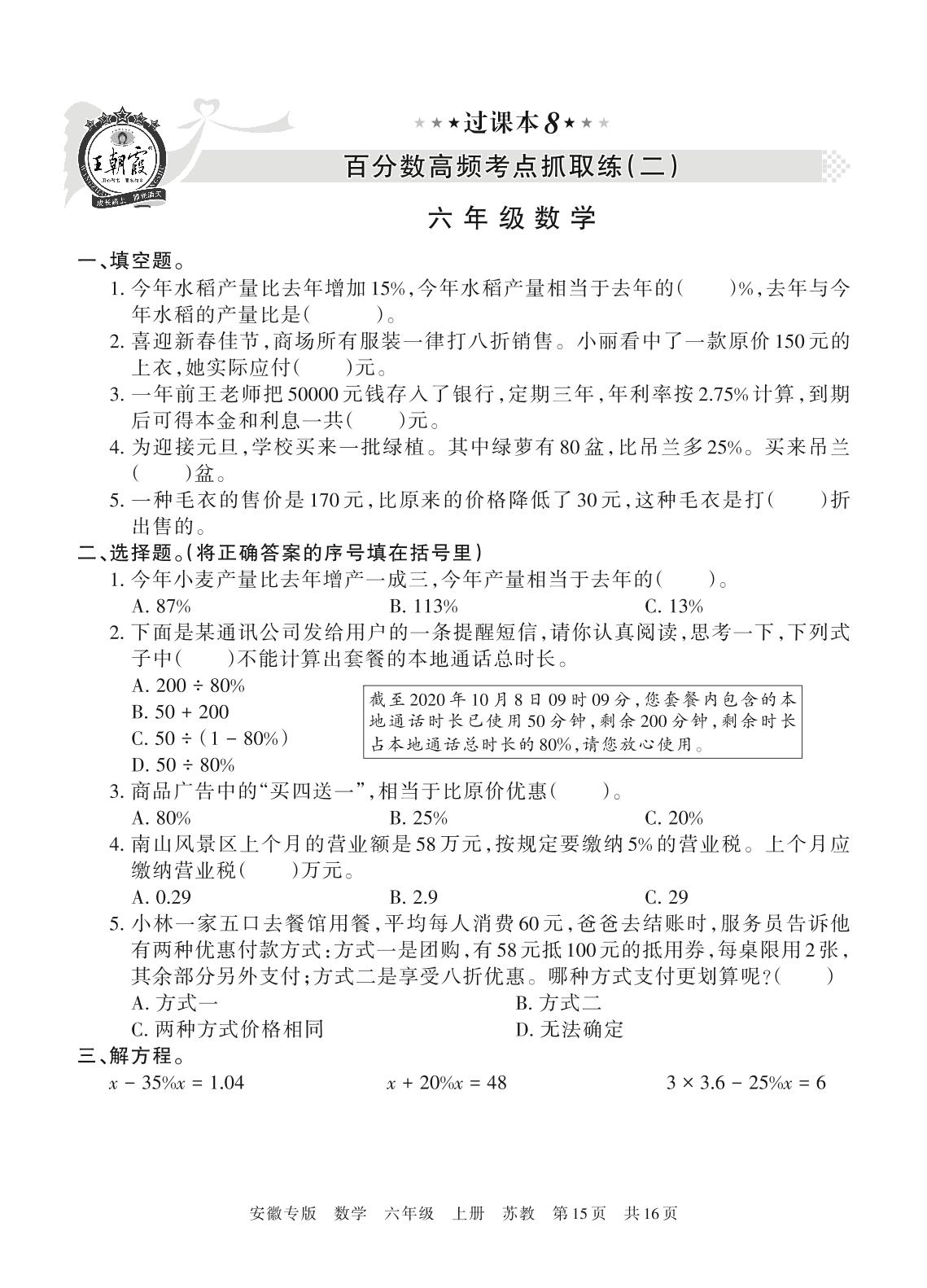 王朝霞期末过课本——百分数高频考点抓取练(二)六年级上册数学(苏教版)【8】