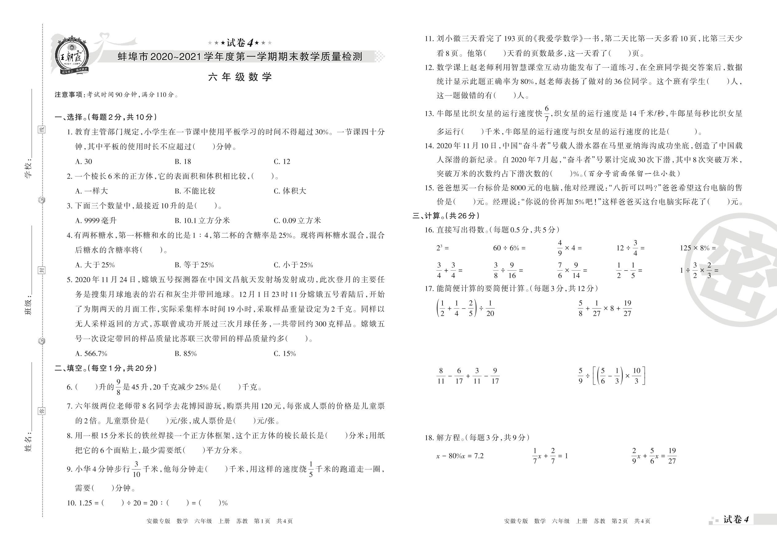 蚌埠市2020~2021学年度第一学期期末教学质量检测六年级数学(苏教版)【4】