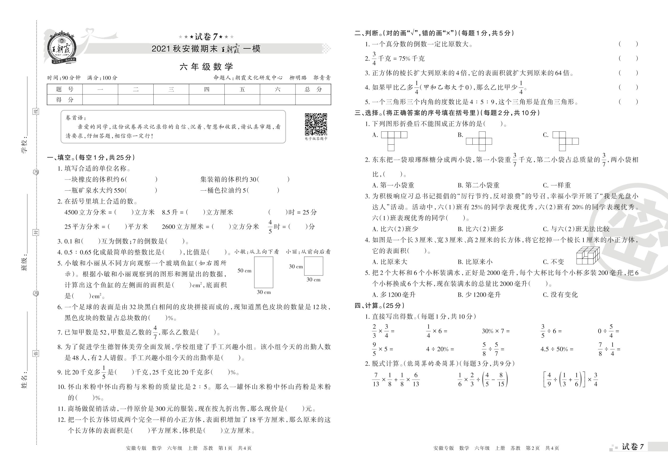 王朝霞期末模拟卷六年级上册数学(苏教版)【7】