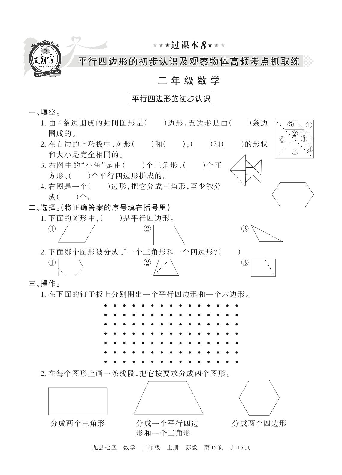 王朝霞期末过课本——平行四边形的初步认识及观察物体二年级上册数学(苏教版)【8】