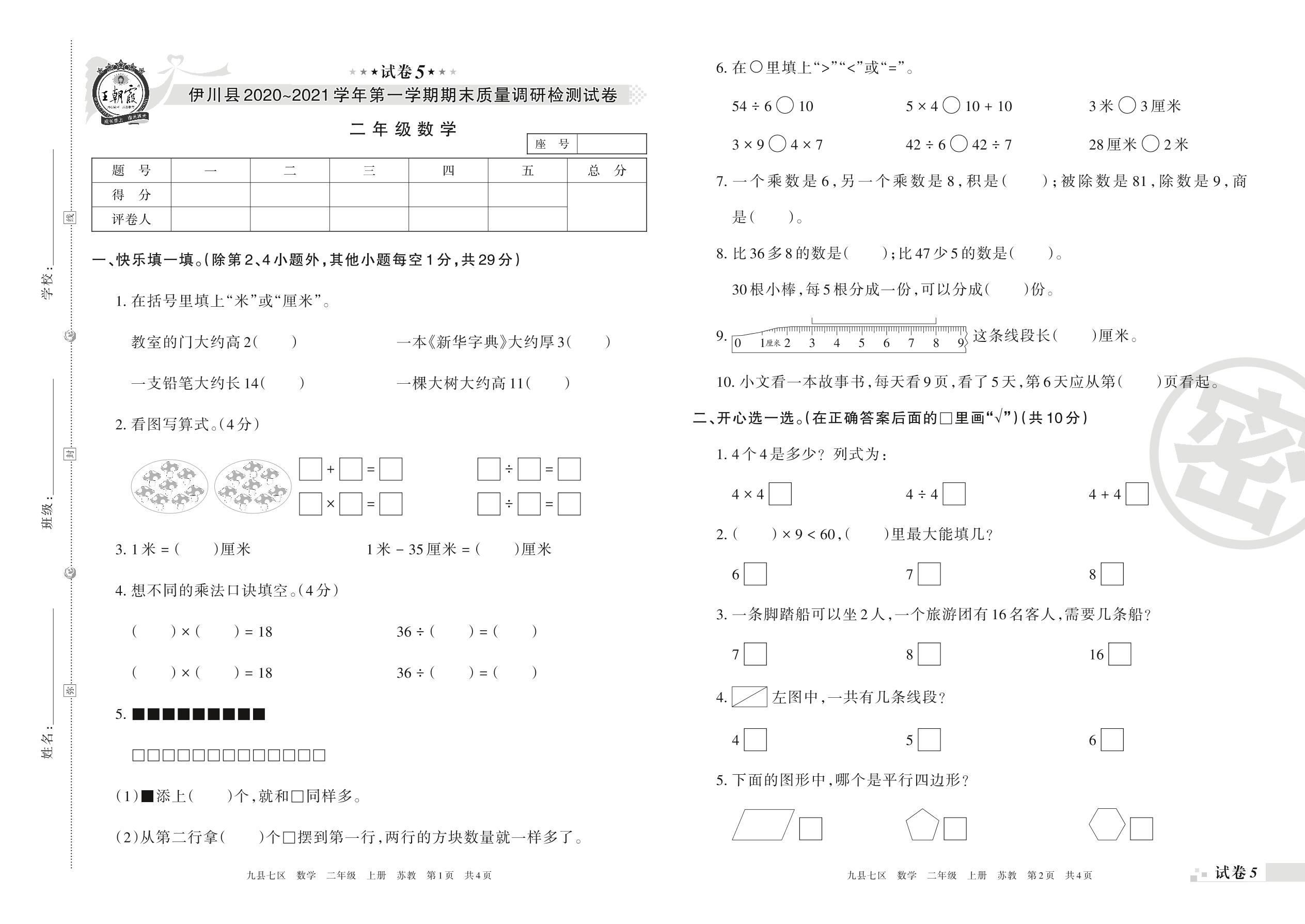 伊川县2020~2021学年第一学期期末质量调研检测试卷二年级数学(苏教版)【5】