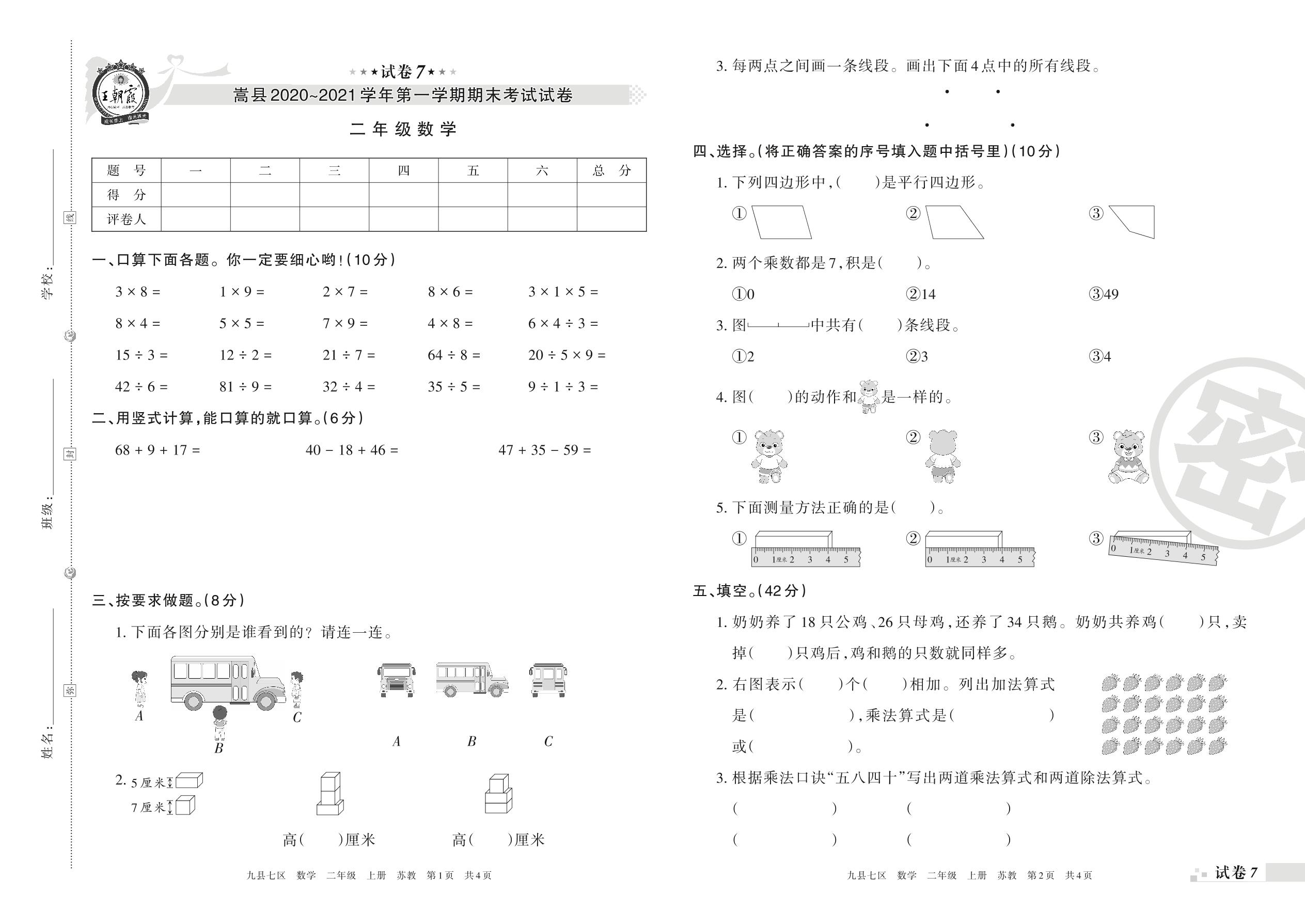 嵩县2020~2021学年第一学期期末考试试卷二年级数学(苏教版)【7】