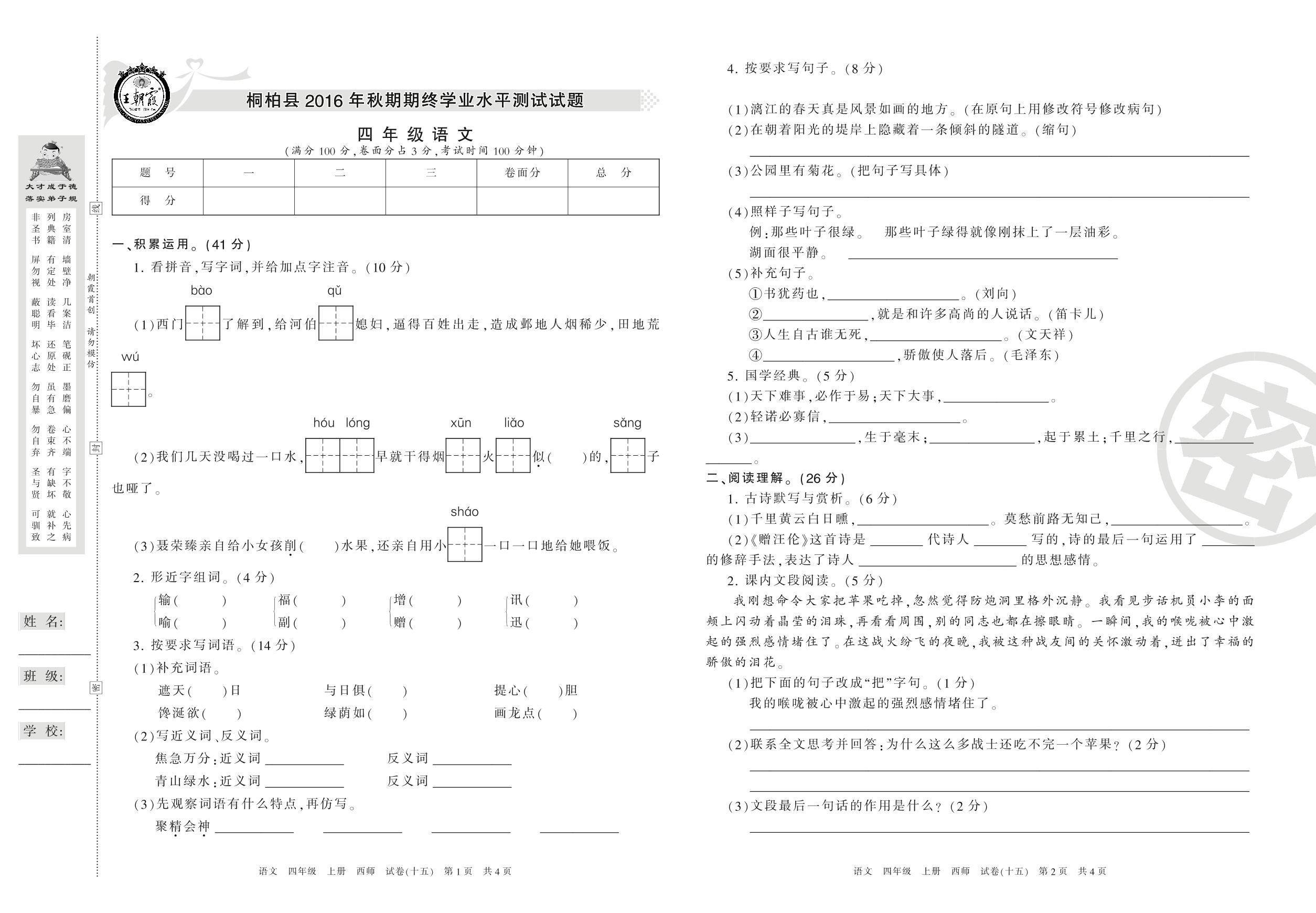 2016-2017学年第一学期南阳市桐柏县四年级语文试卷(西师版)【15】
