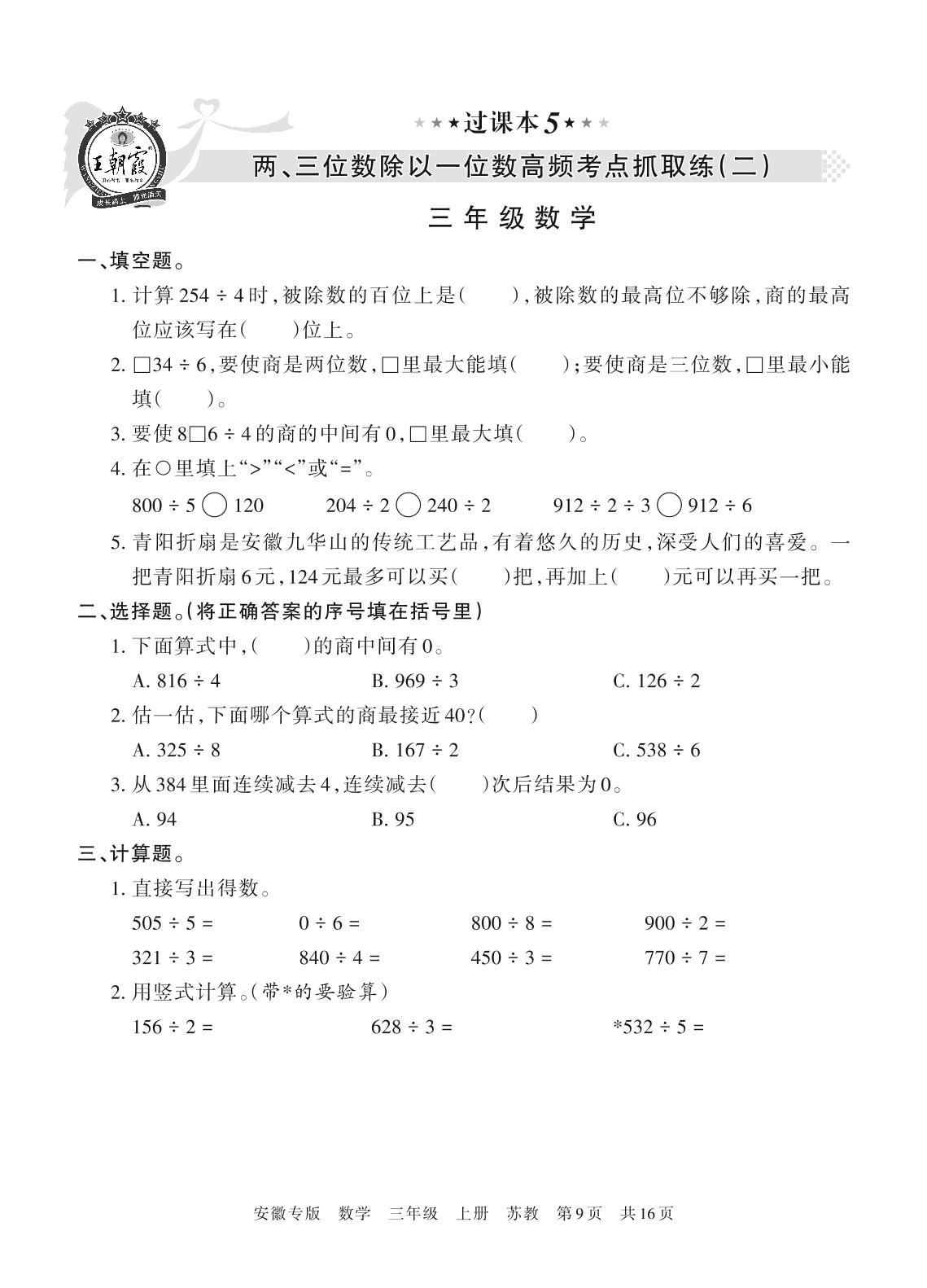王朝霞期末过课本——两、三位数除以一位数高频考点抓取练(二)三年级上册数学(苏教版)【5】