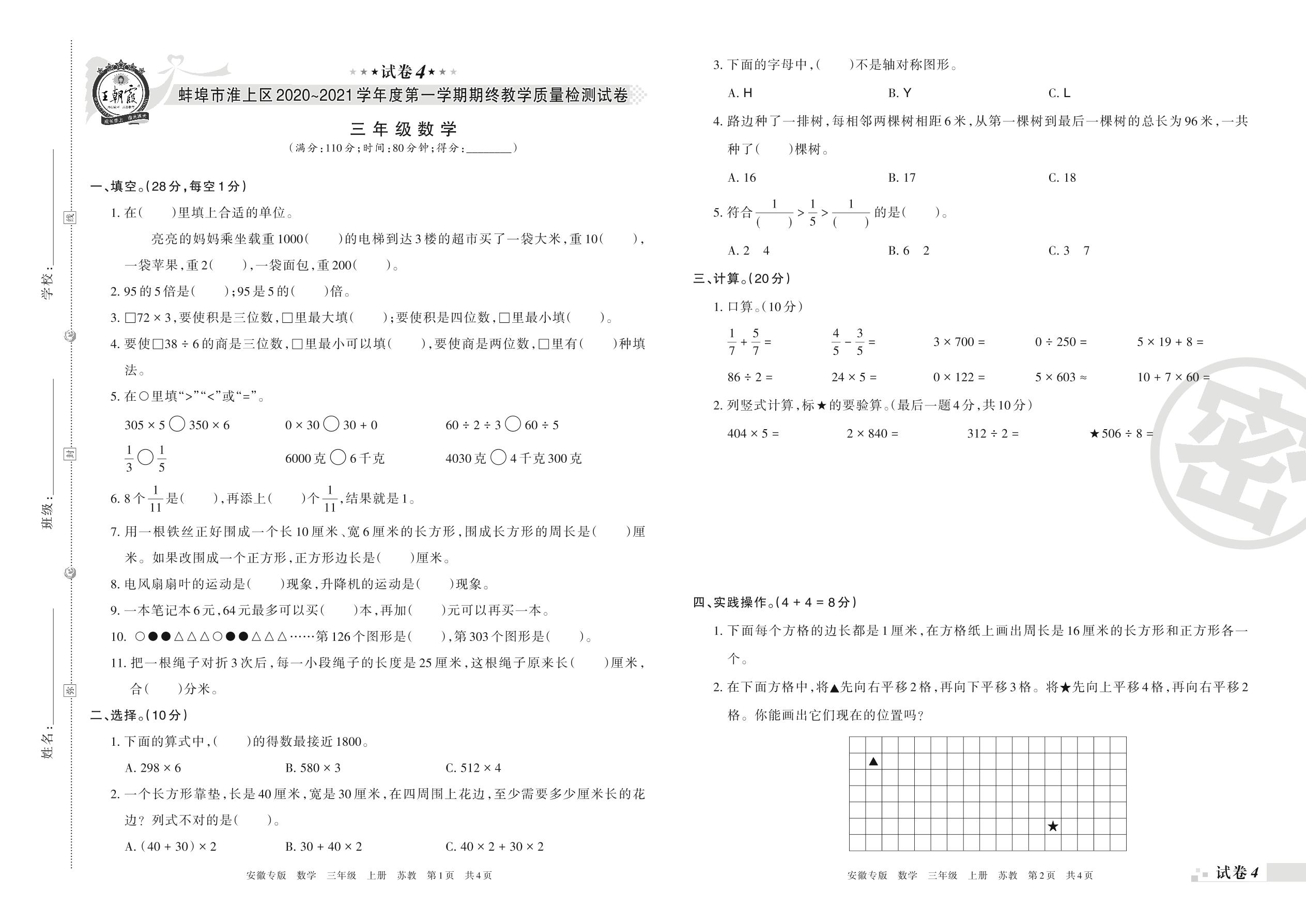 蚌埠市淮上区2020~2021学年度第一学期期终教学质量检测试卷三年级数学(苏教版)【4】