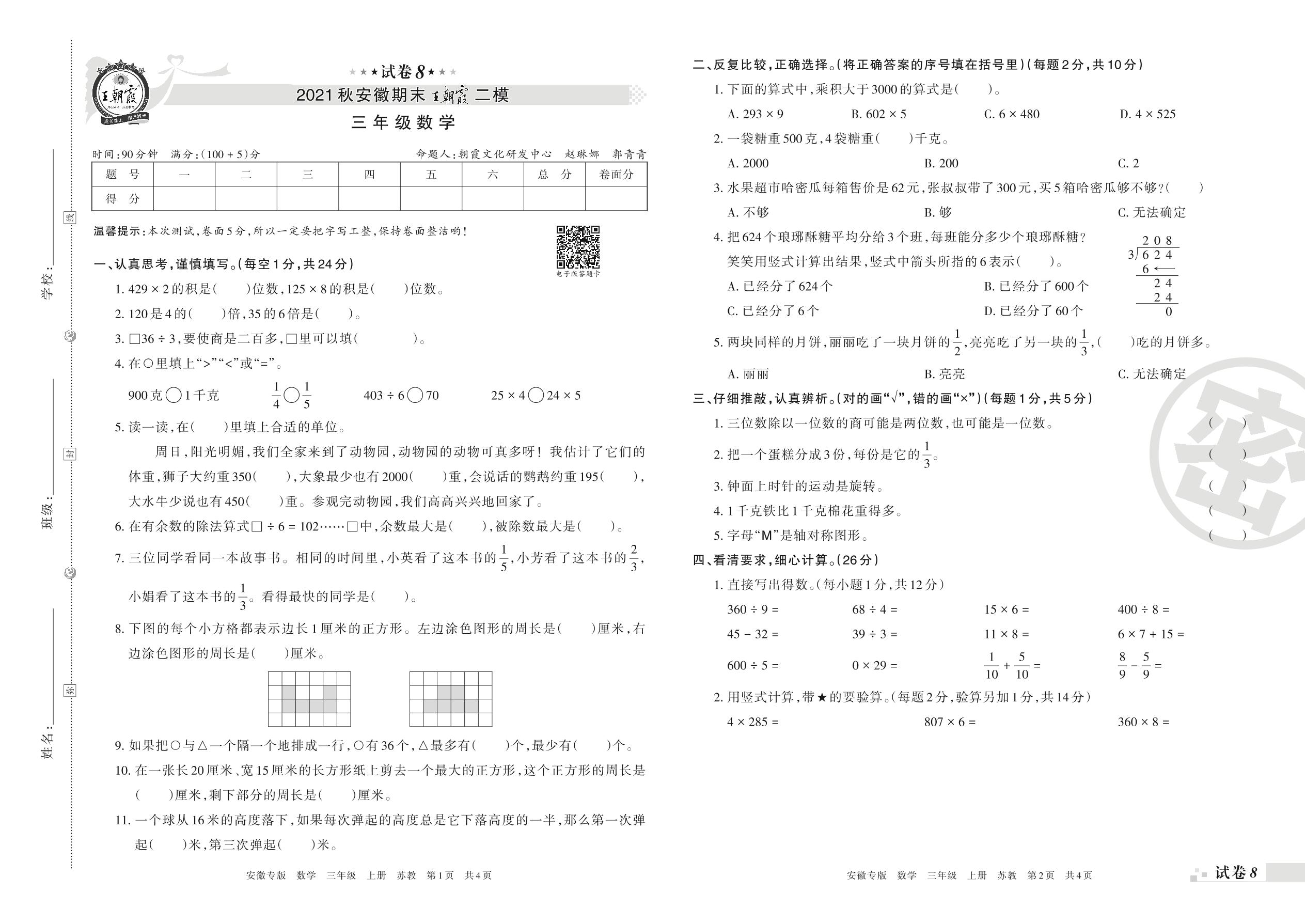 王朝霞期末模拟卷三年级上册数学(苏教版)_R211223141531824【8】