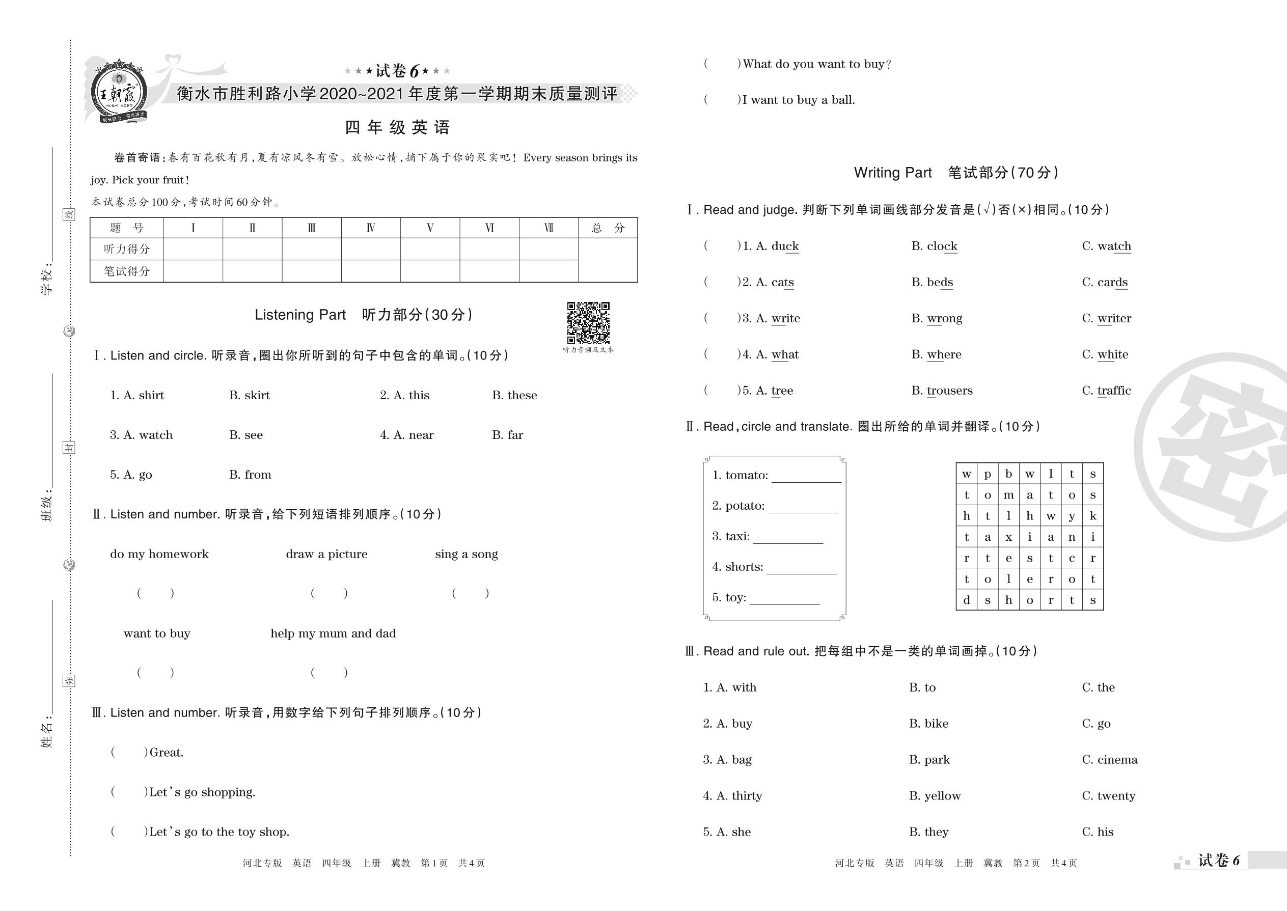 衡水市胜利路小学2020~2021年度第一学期期末质量测评四年级上册英语(冀教版)【6】