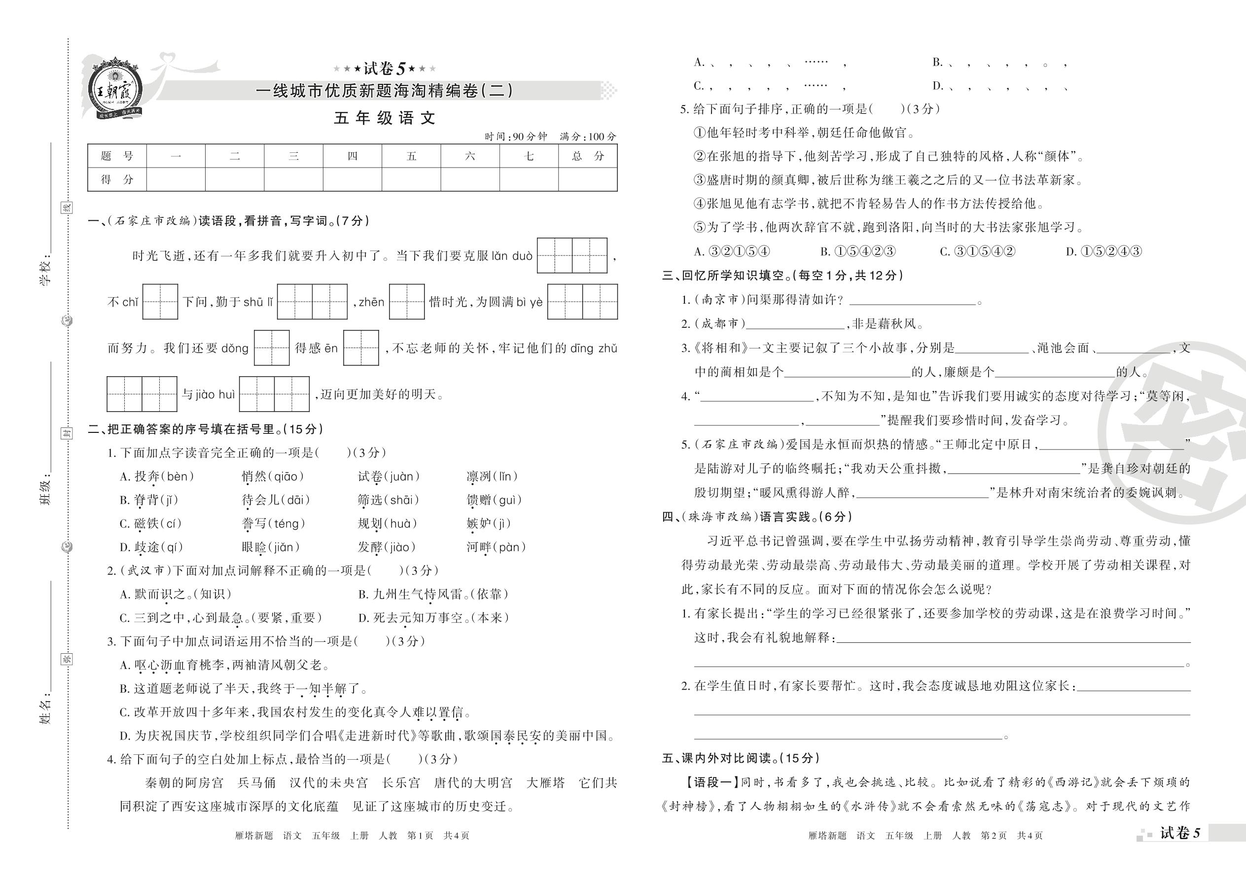 一线城市优质新题海淘精编卷(二)五年级上册语文(人教版)【5】