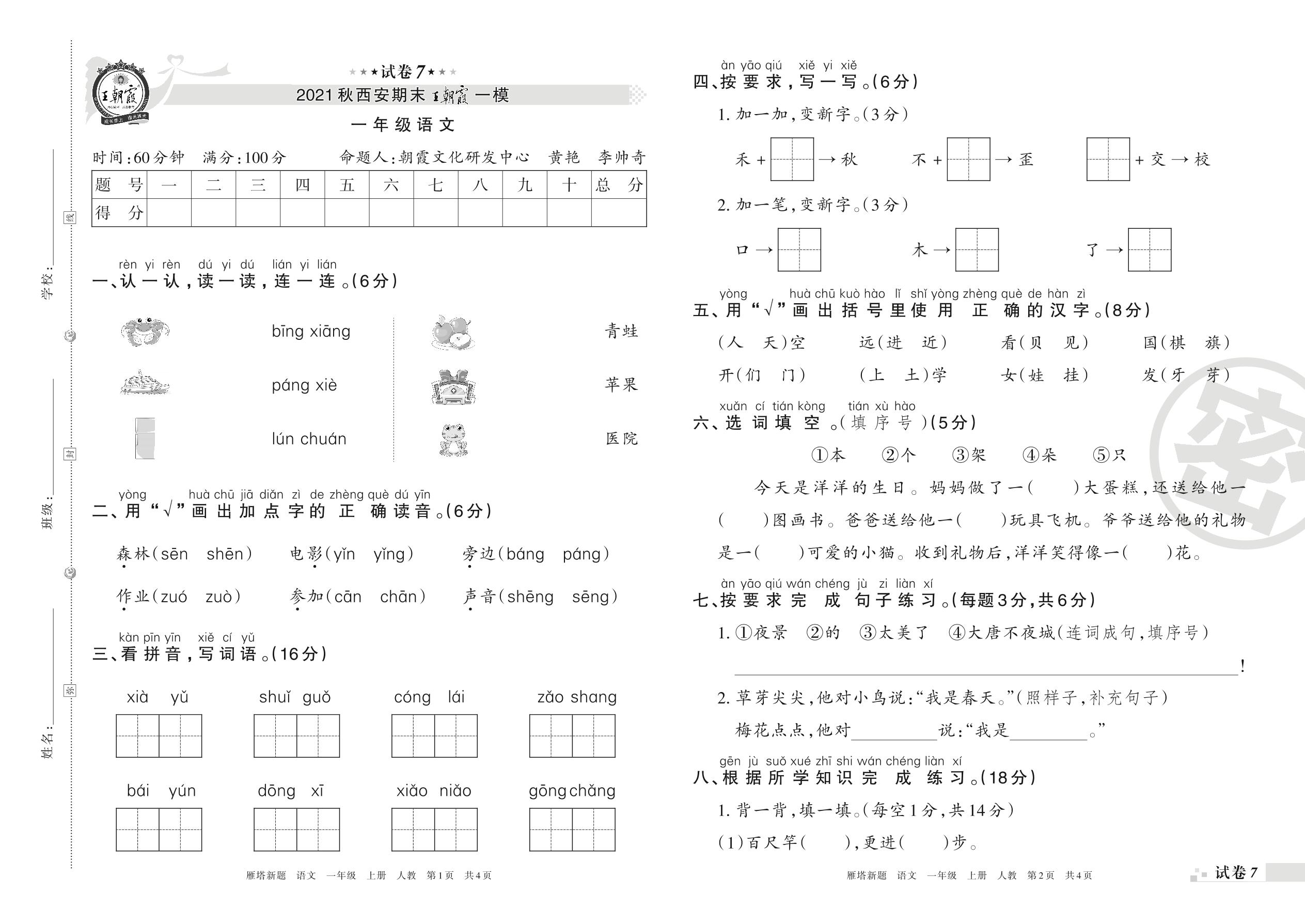 王朝霞期末模拟卷一年级上册语文(人教版)_R211223142312879【7】