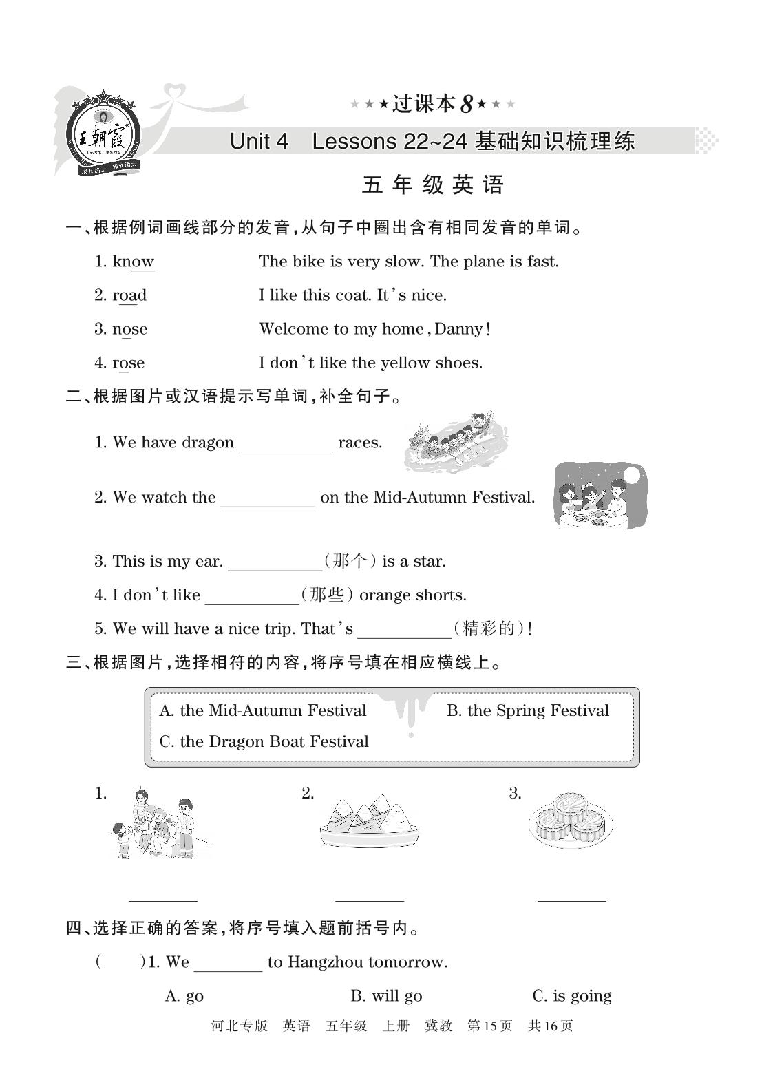 王朝霞期末过课本——Unit 4 Lessons 22~24 基础知识梳理练五年级上册英语(冀教版)【8】