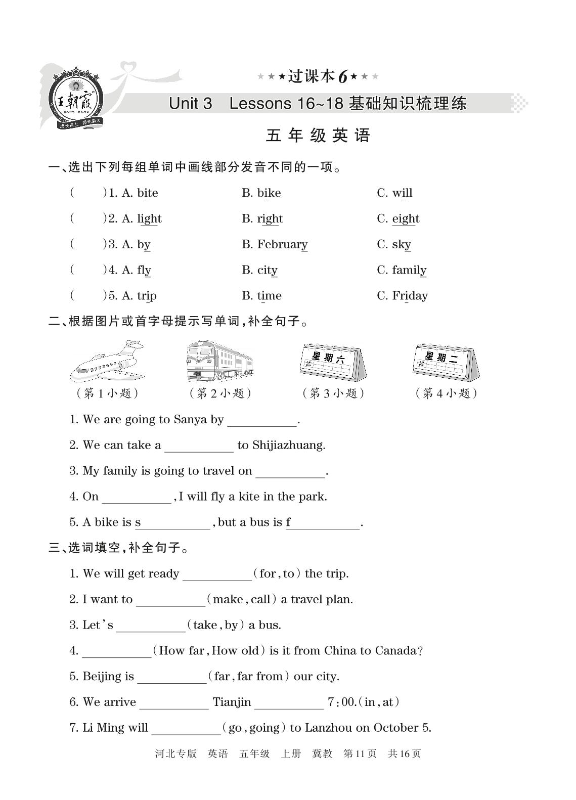 王朝霞期末过课本——Unit 3 Lessons 16~18 基础知识梳理练五年级上册英语(冀教版)【6】