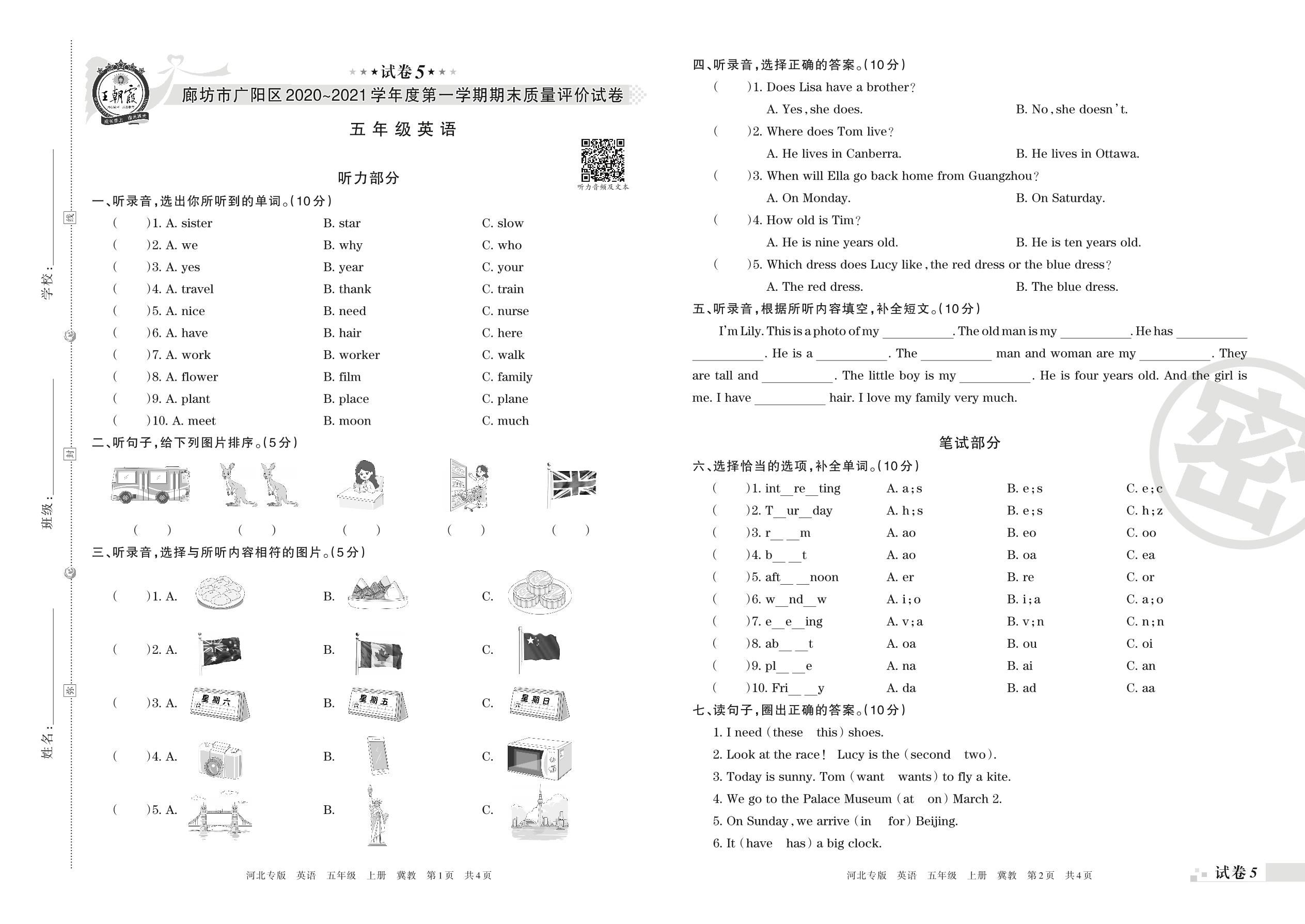 廊坊市广阳区2020~2021学年度第一学期期末质量评价试卷五年级上册英语(冀教版)【5】