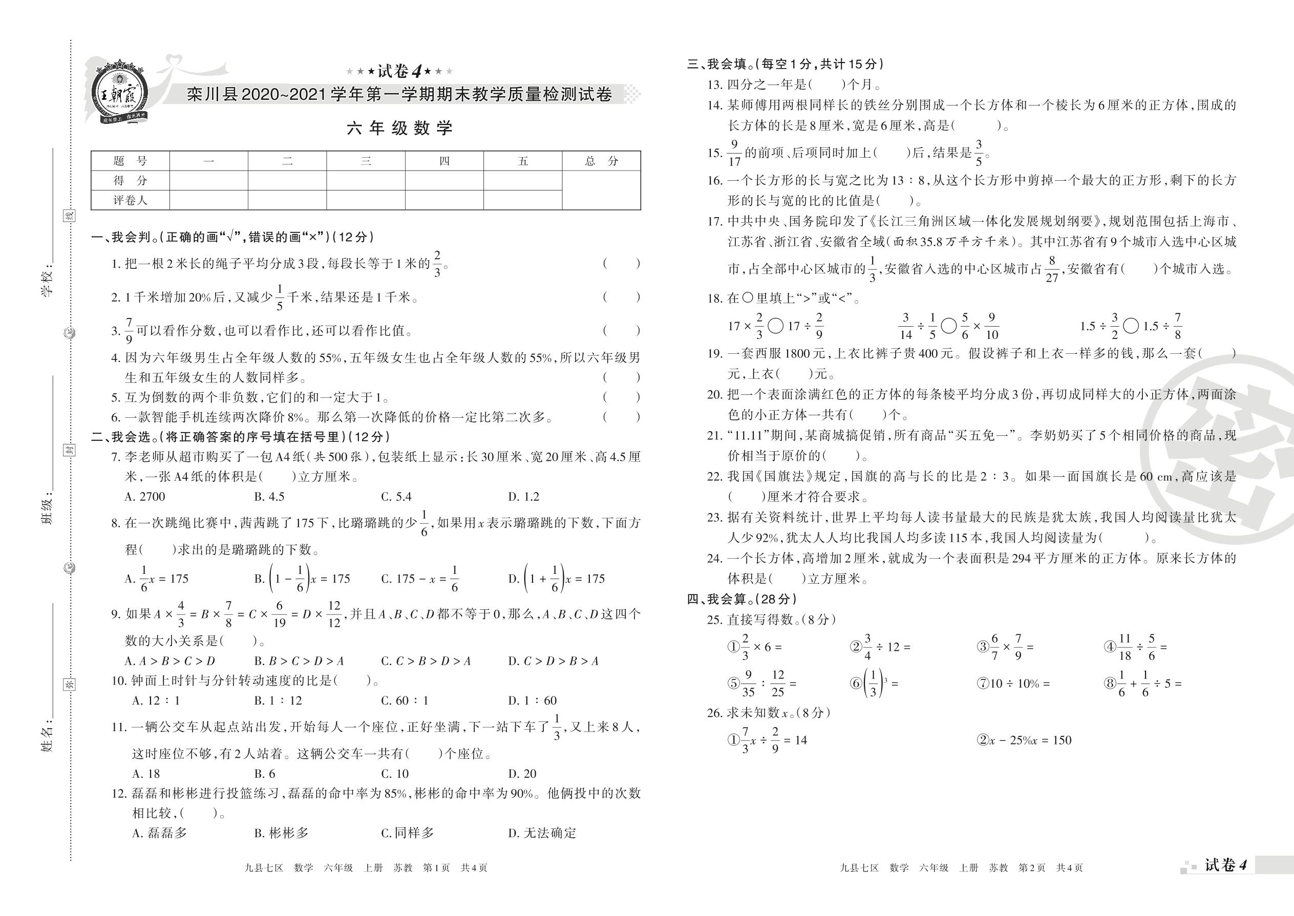 栾川县2020~2021学年第一学期期末教学质量检测试卷六年级数学(苏教版)【4】
