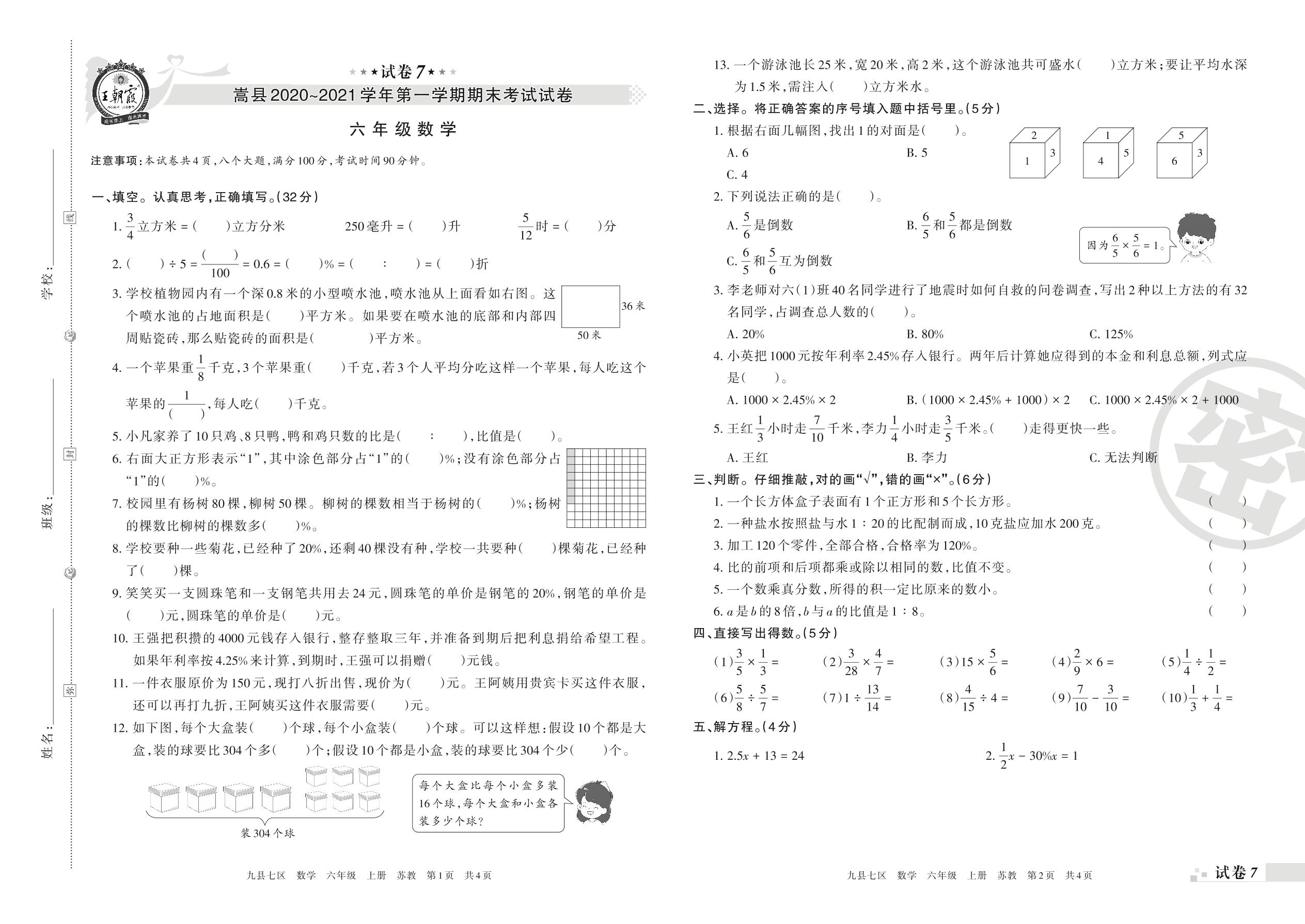 嵩县2020~2021学年第一学期期末考试试卷六年级数学(苏教版)【7】