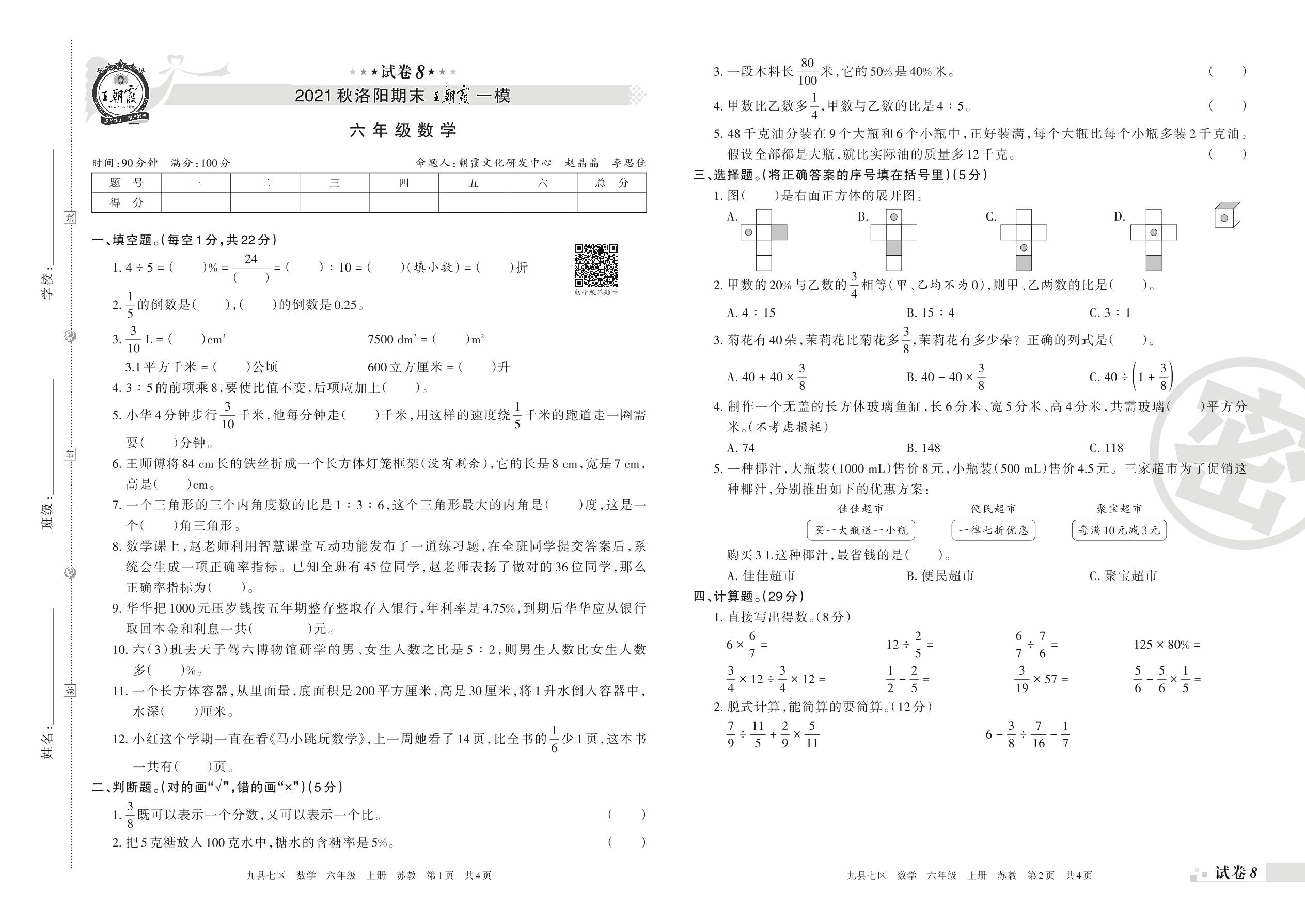 王朝霞期末模拟卷六年级上册数学(苏教版)_R211223142451643【8】
