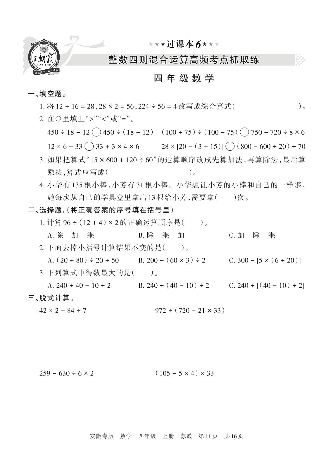 王朝霞期末过课本——整数四则混合运算高频考点抓取练四年级上册数学(苏教版)【6】