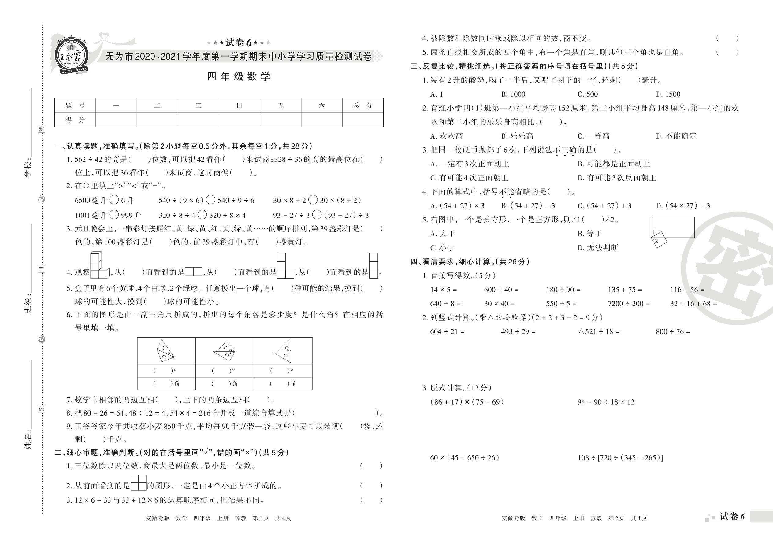 无为市2020~2021学年度第一学期期末中小学学习质量检测试卷四年级数学(苏教版)【6】
