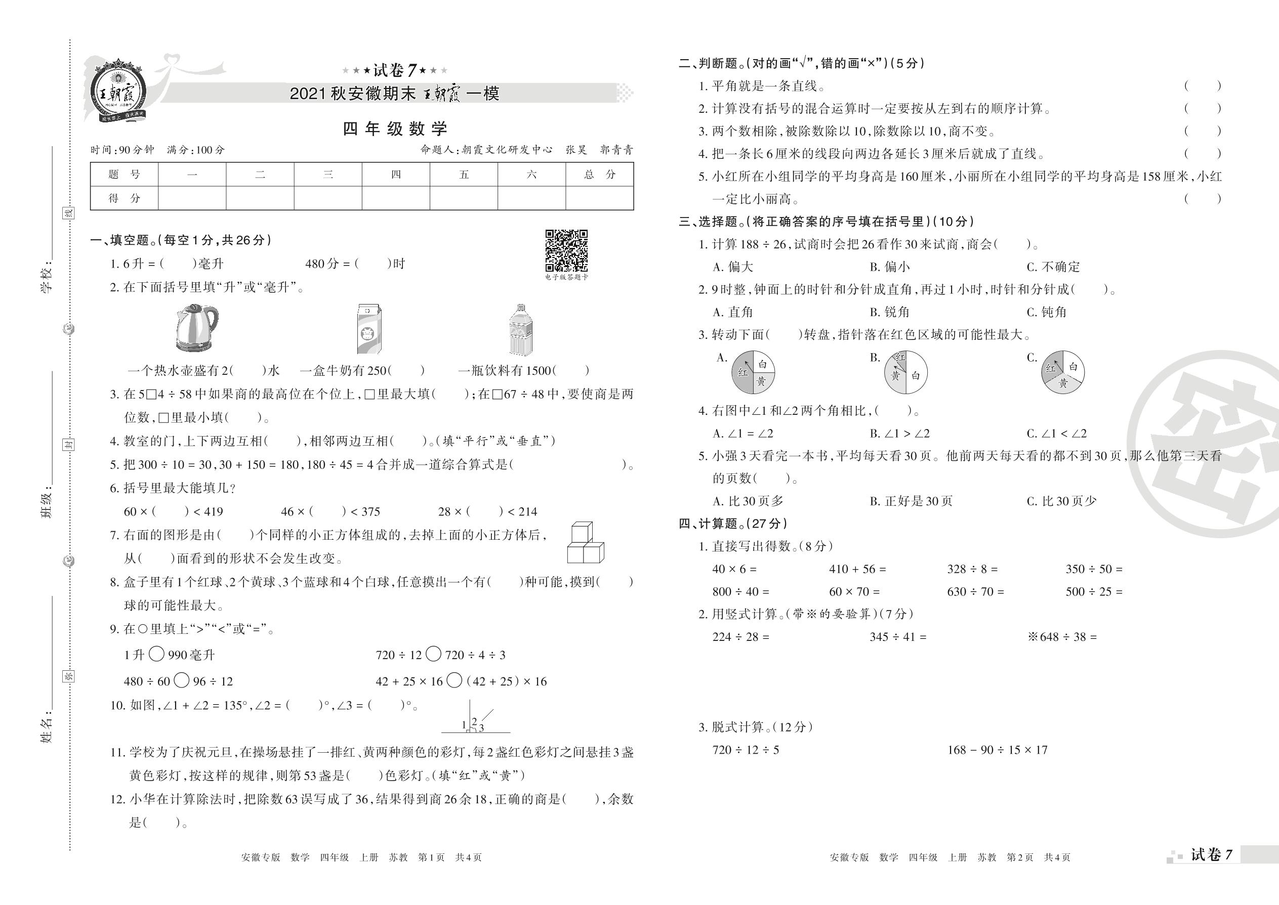 王朝霞期末模拟卷四年级上册数学(苏教版)【7】