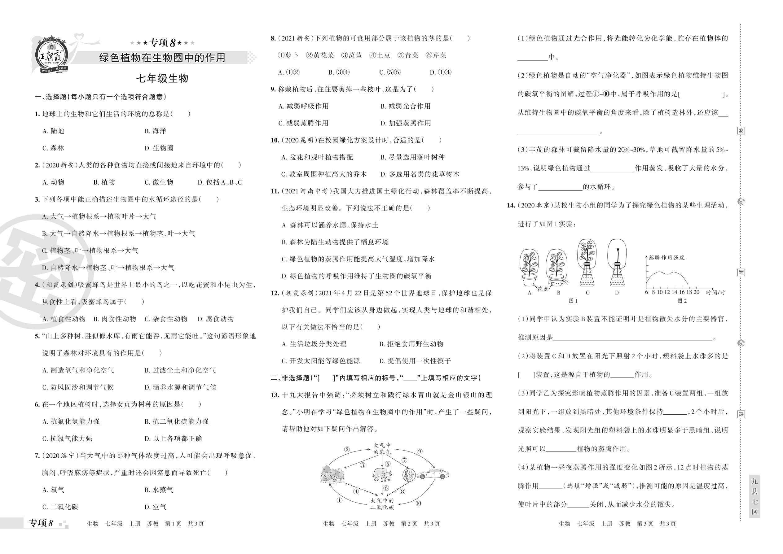 王朝霞期末专项卷——绿色植物在生物圈中的作用七年级上册生物(苏教版)【8】