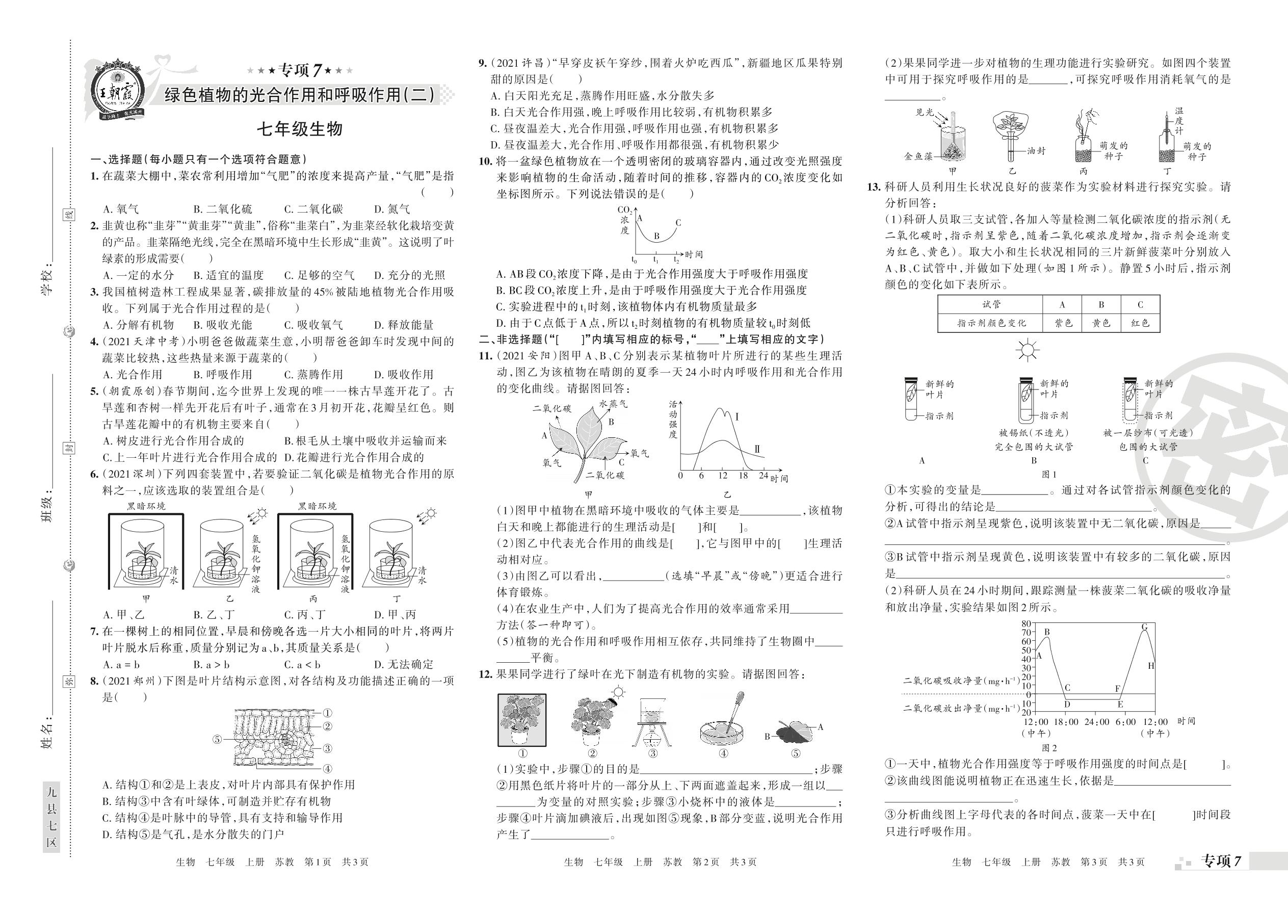 王朝霞期末专项卷——绿色植物的光合作用和呼吸作用(二)七年级上册生物(苏教版)【7】
