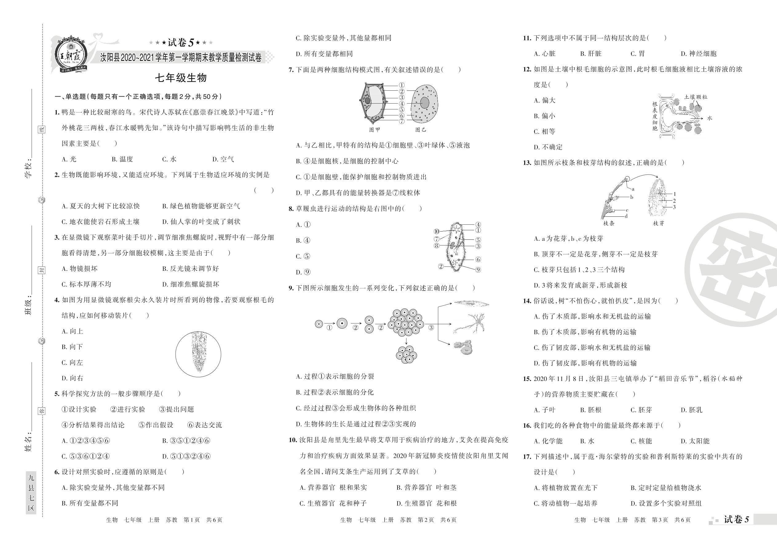 汝阳县2020~2021学年第一学期期末教学质量检测试卷七年级生物(苏教版)【5】