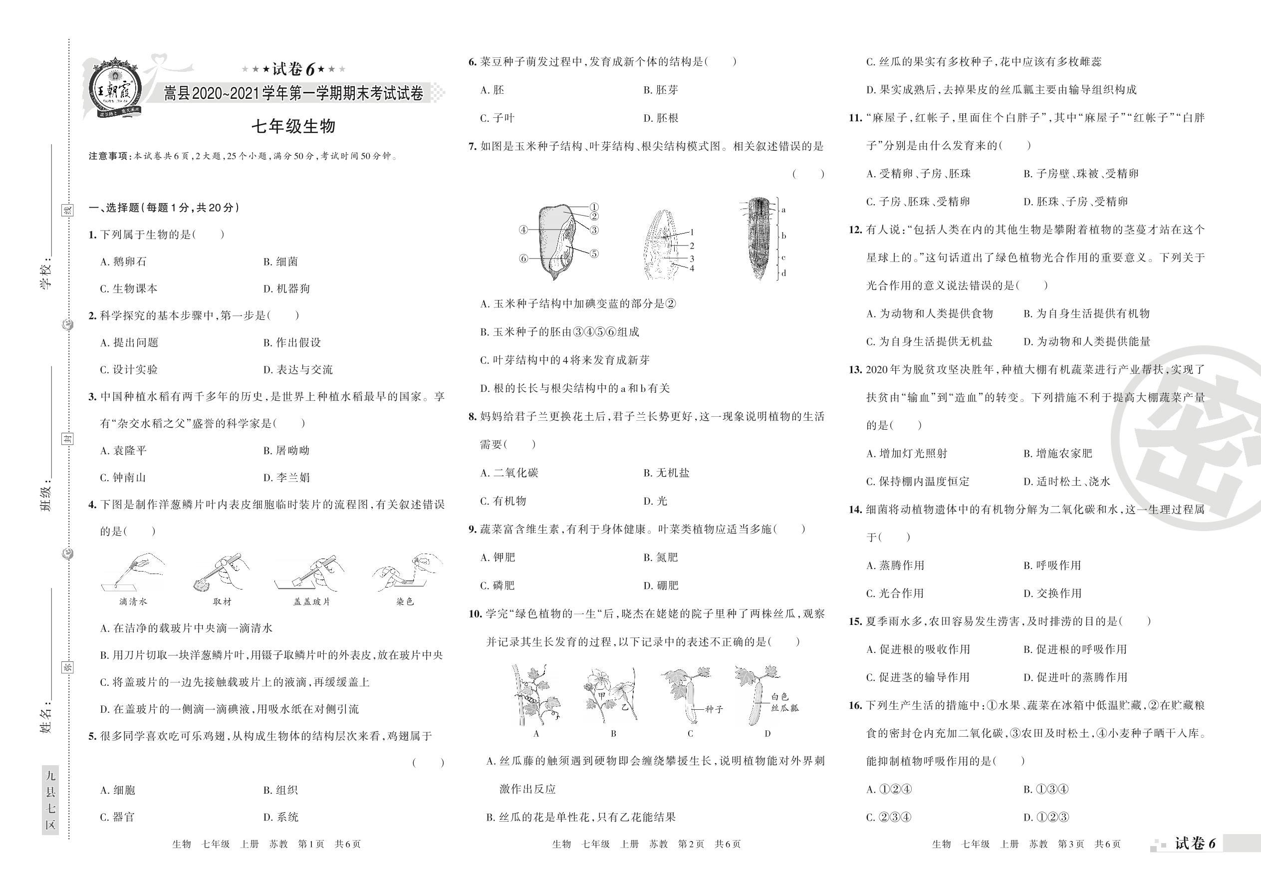 嵩县2020~2021学年第一学期期末考试试卷七年级生物(苏教版)【6】