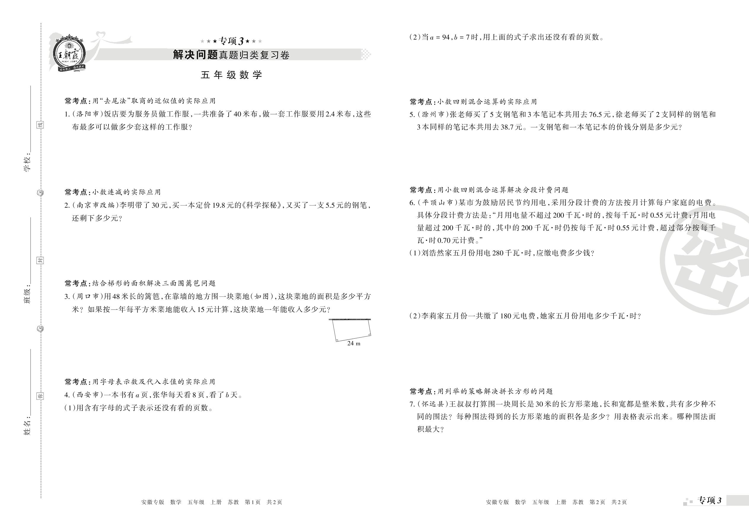 王朝霞期末专项卷——解决问题真题归类复习五年级上册数学(苏教版)【3】