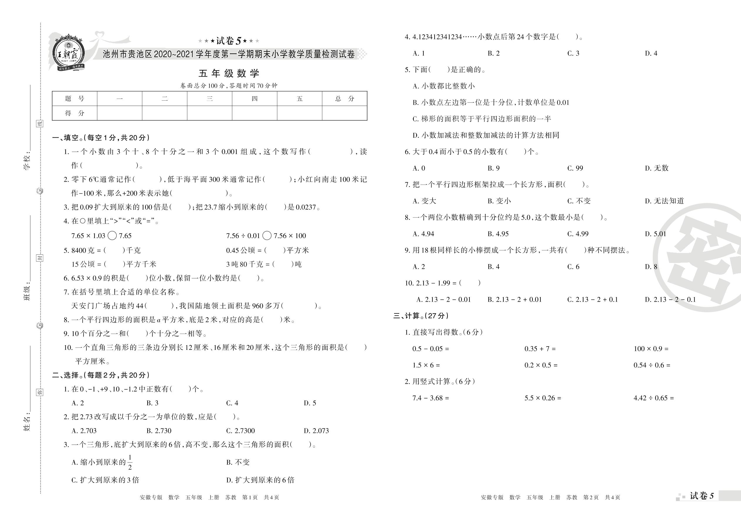 池州市贵池区2020~2021学年度第一学期期末小学教学质量检测试卷五年级数学(苏教版)【5】