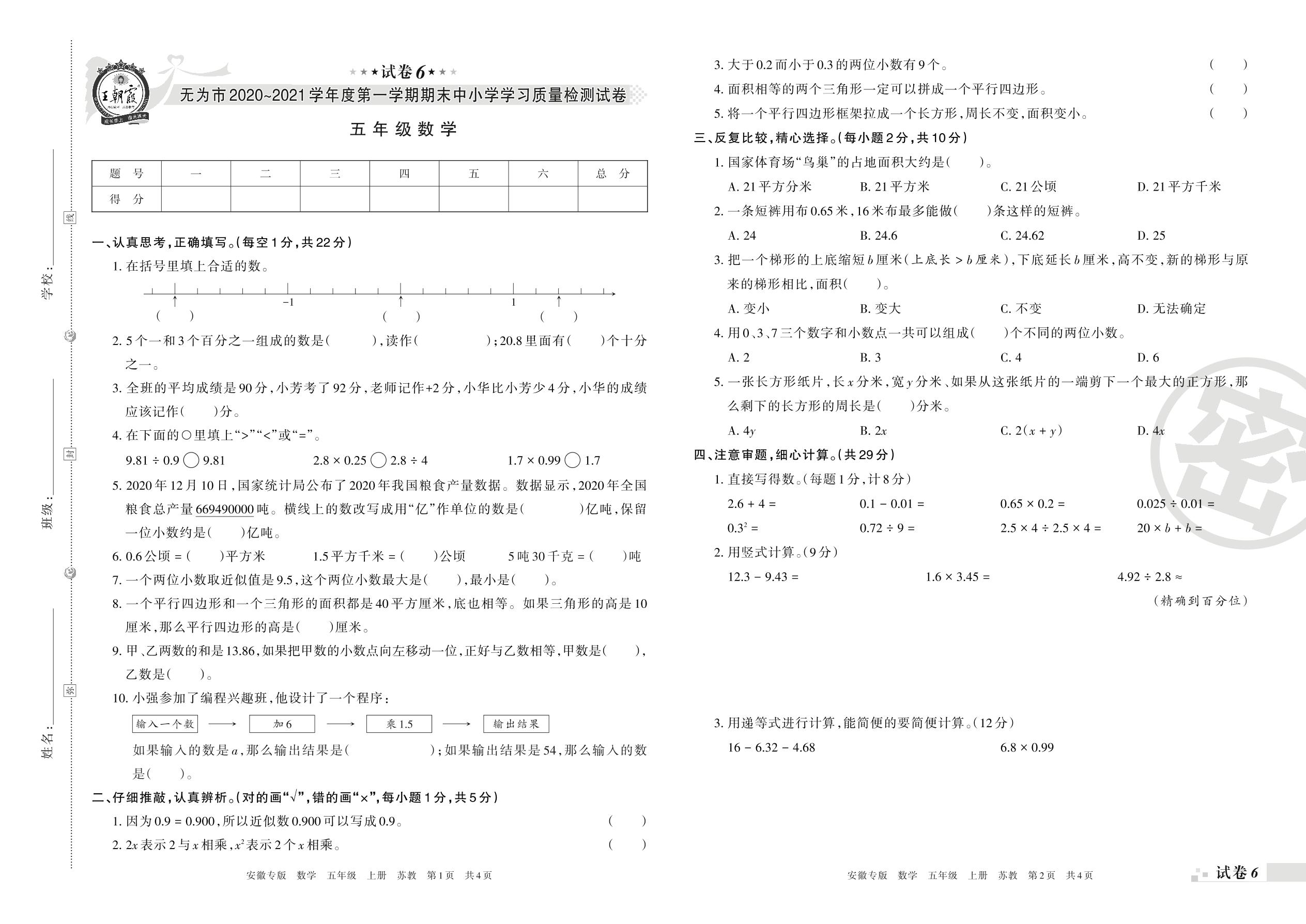 无为市2020~2021学年度第一学期期末中小学学习质量检测试卷五年级数学(苏教版)【6】