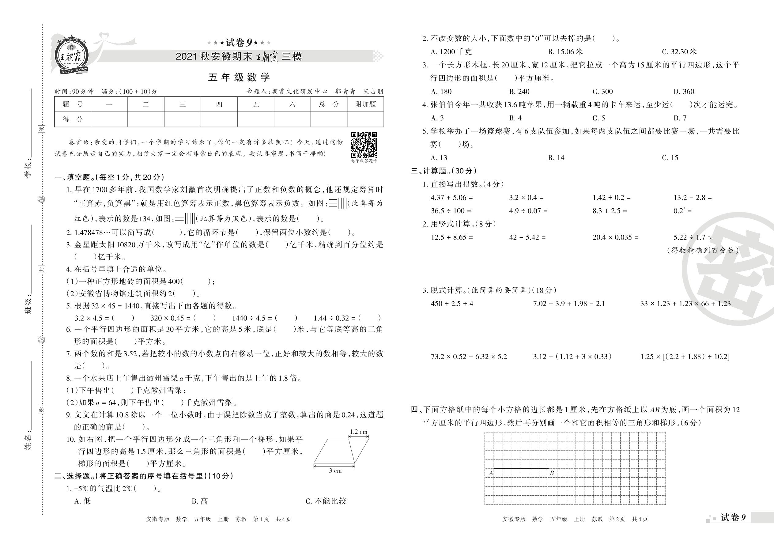 王朝霞期末模拟卷五年级上册数学(苏教版)_R211223143441194【9】