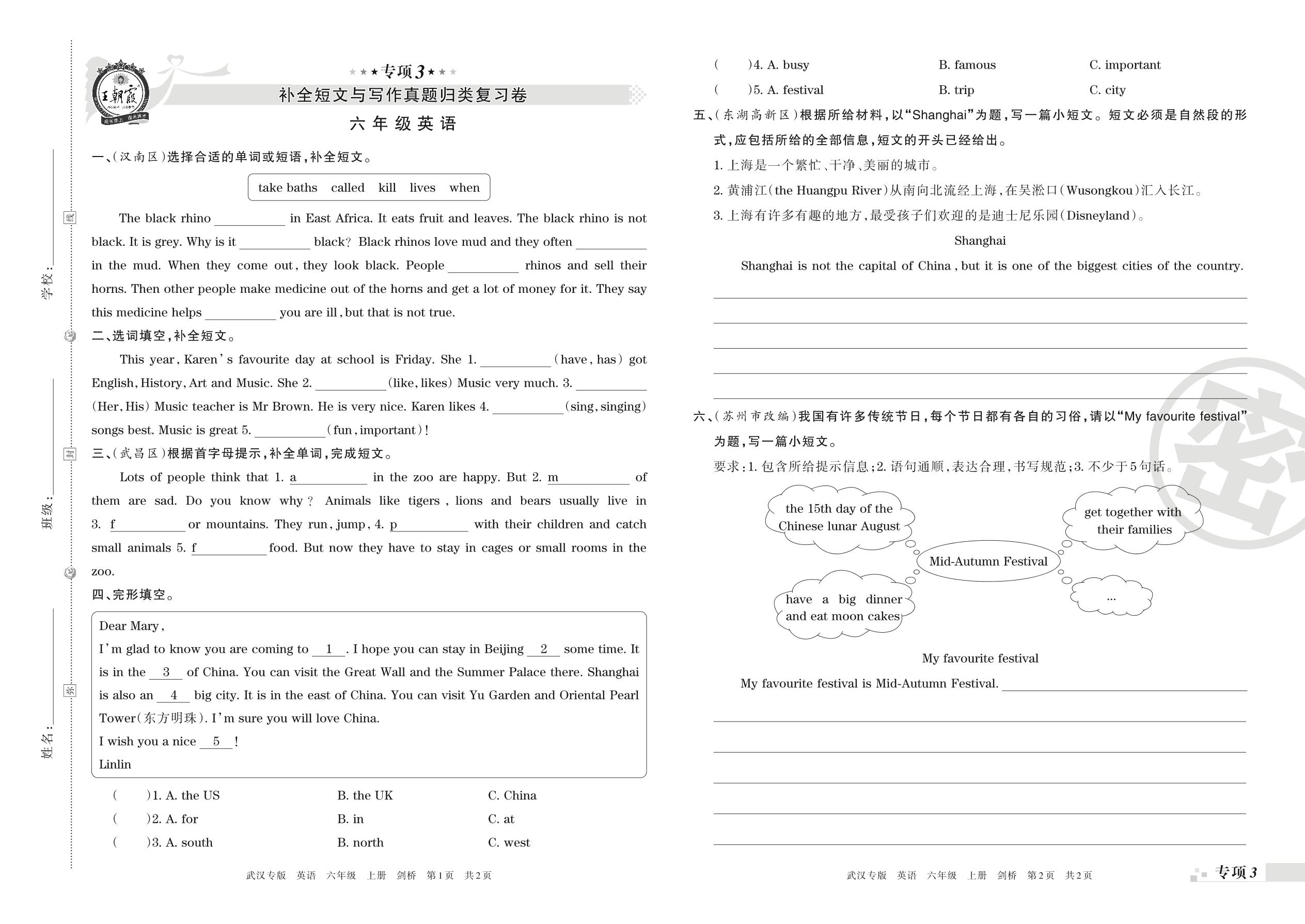 王朝霞期末专项卷——补全短文与写作真题归类复习卷六年级上册英语(剑桥版)【3】