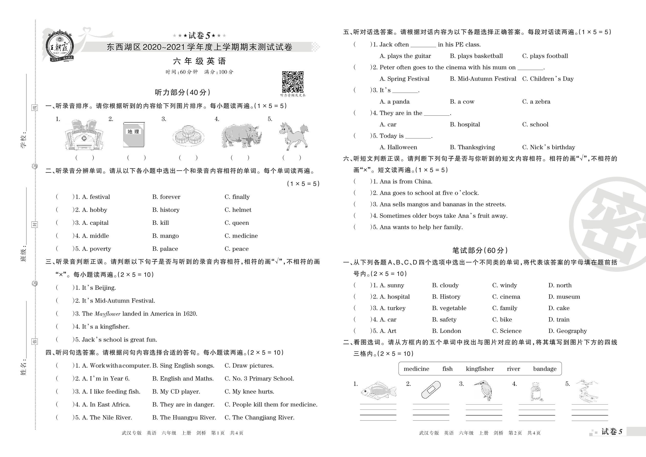 东西湖区2020~2021学年度上学期期末测试试卷六年级英语(剑桥版)【5】