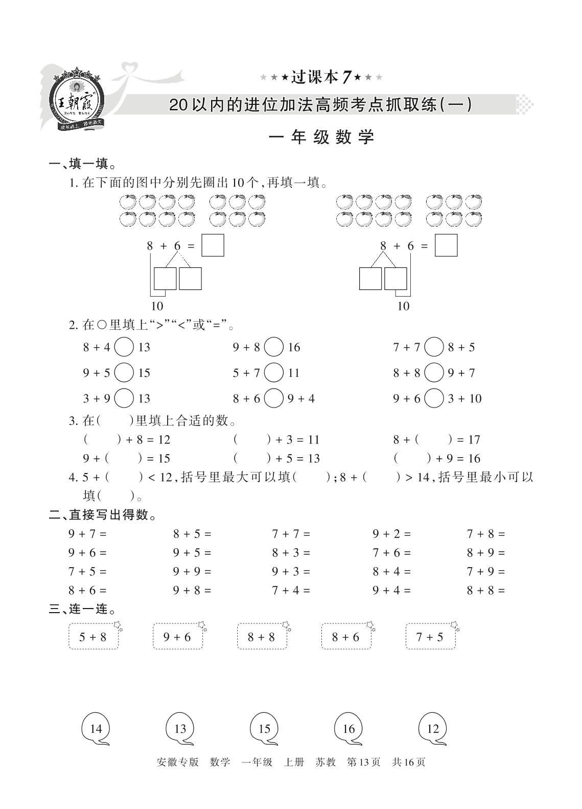 王朝霞期末过课本——20以内的进位加法高频考点抓取练(一)一年级上册数学(苏教版)【7】