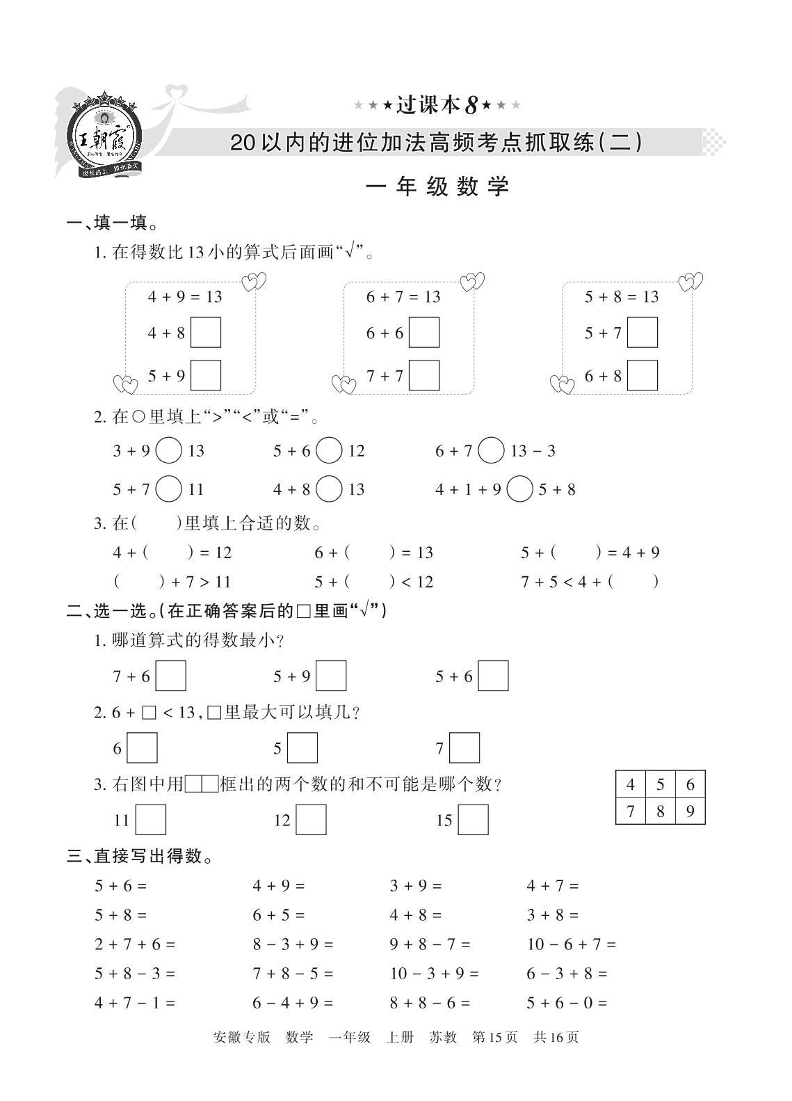 王朝霞期末过课本——20以内的进位加法高频考点抓取练(二)一年级上册数学(苏教版)【8】