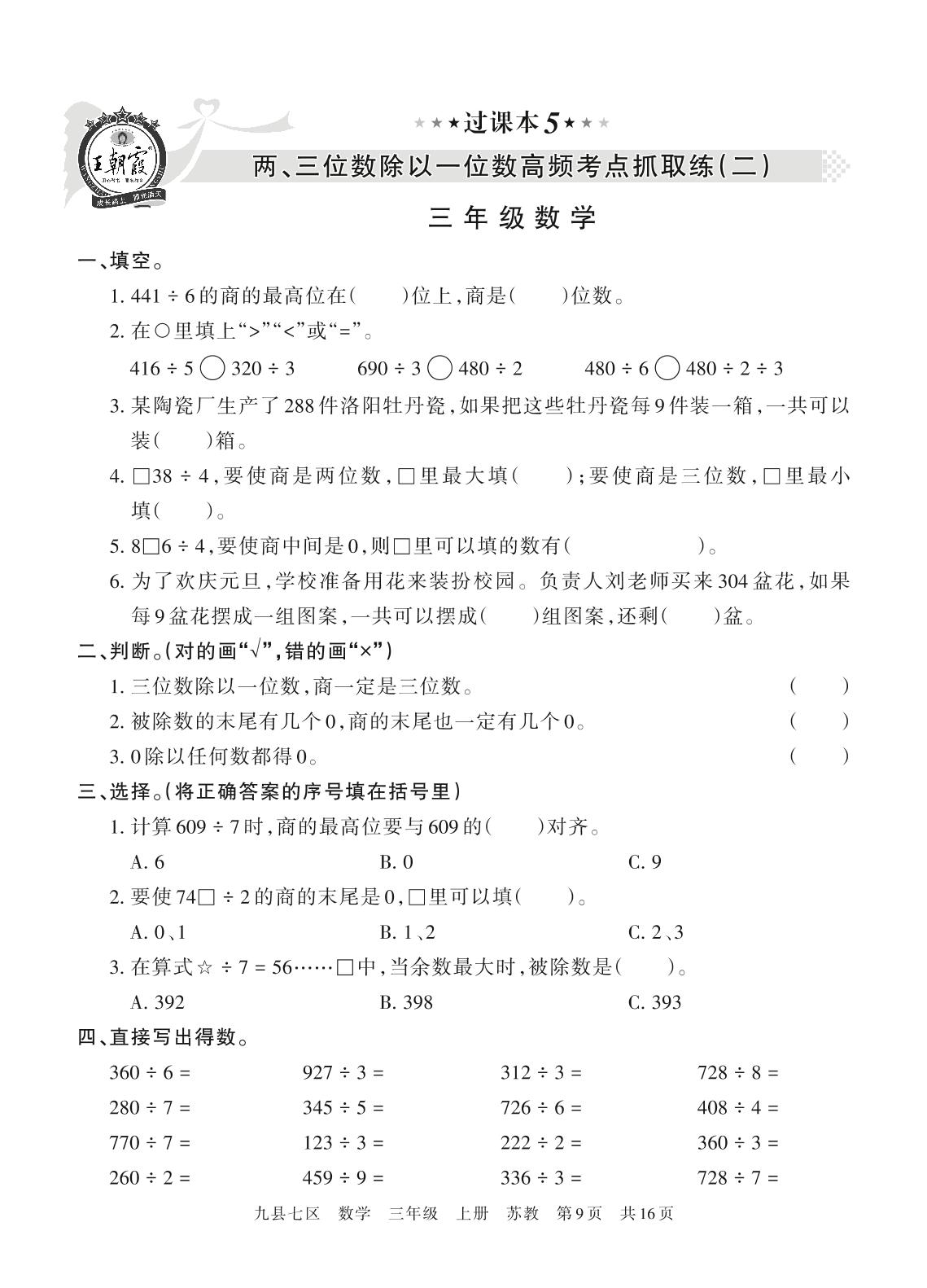 王朝霞期末过课本——两、三位数除以一位数高频考点抓取练(二)三年级上册数学(苏教版)_R211223144318458【5】