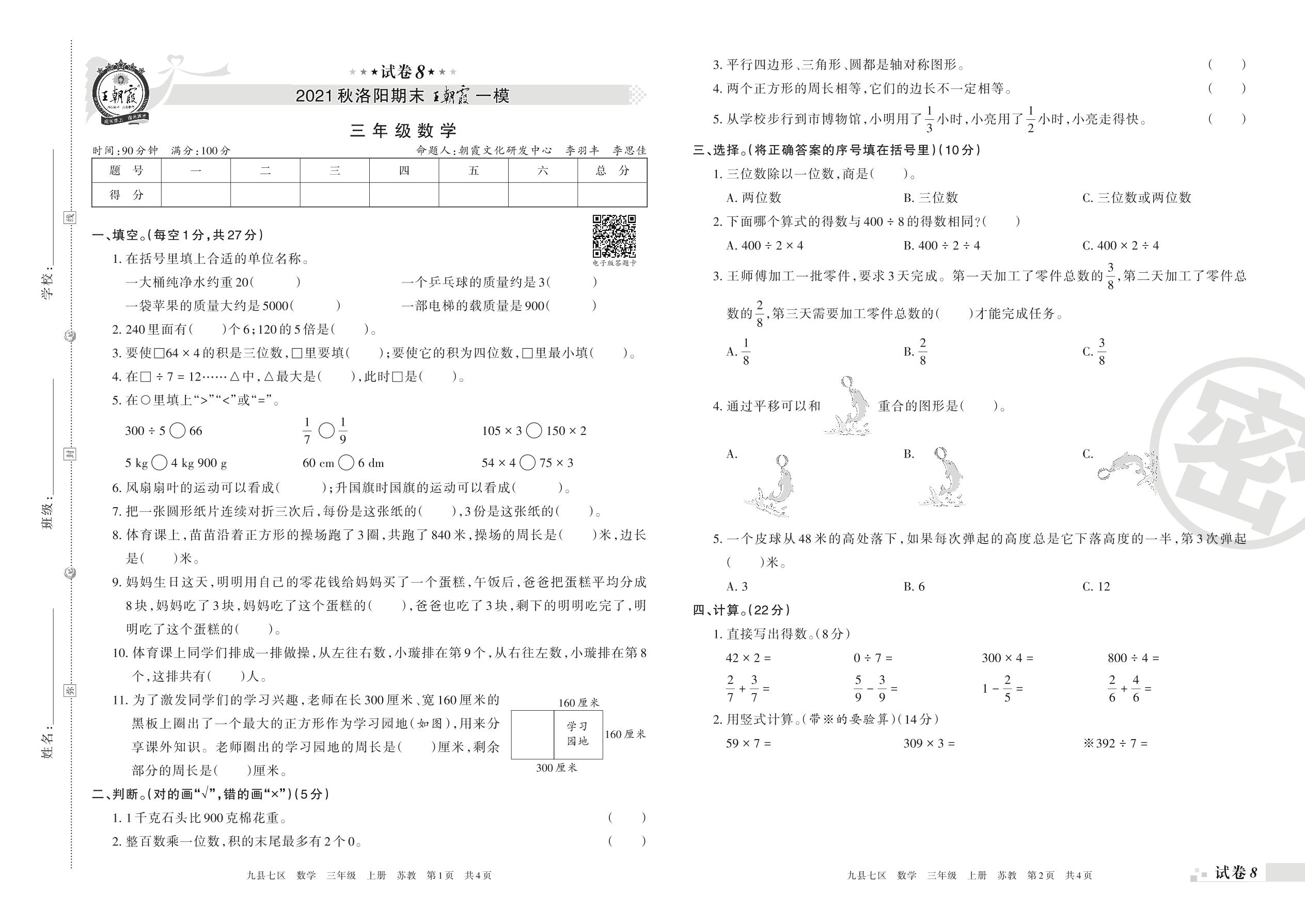 王朝霞期末模拟卷三年级上册数学(苏教版)_R211223144319263【8】