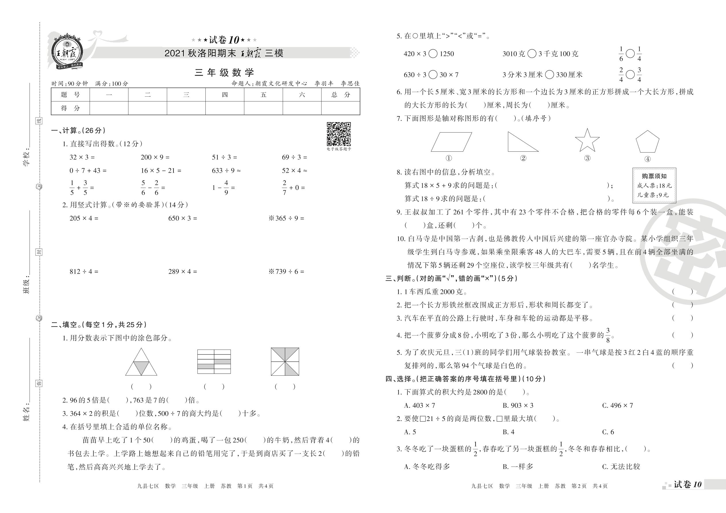 王朝霞期末模拟卷三年级上册数学(苏教版)_R211223144319704【10】
