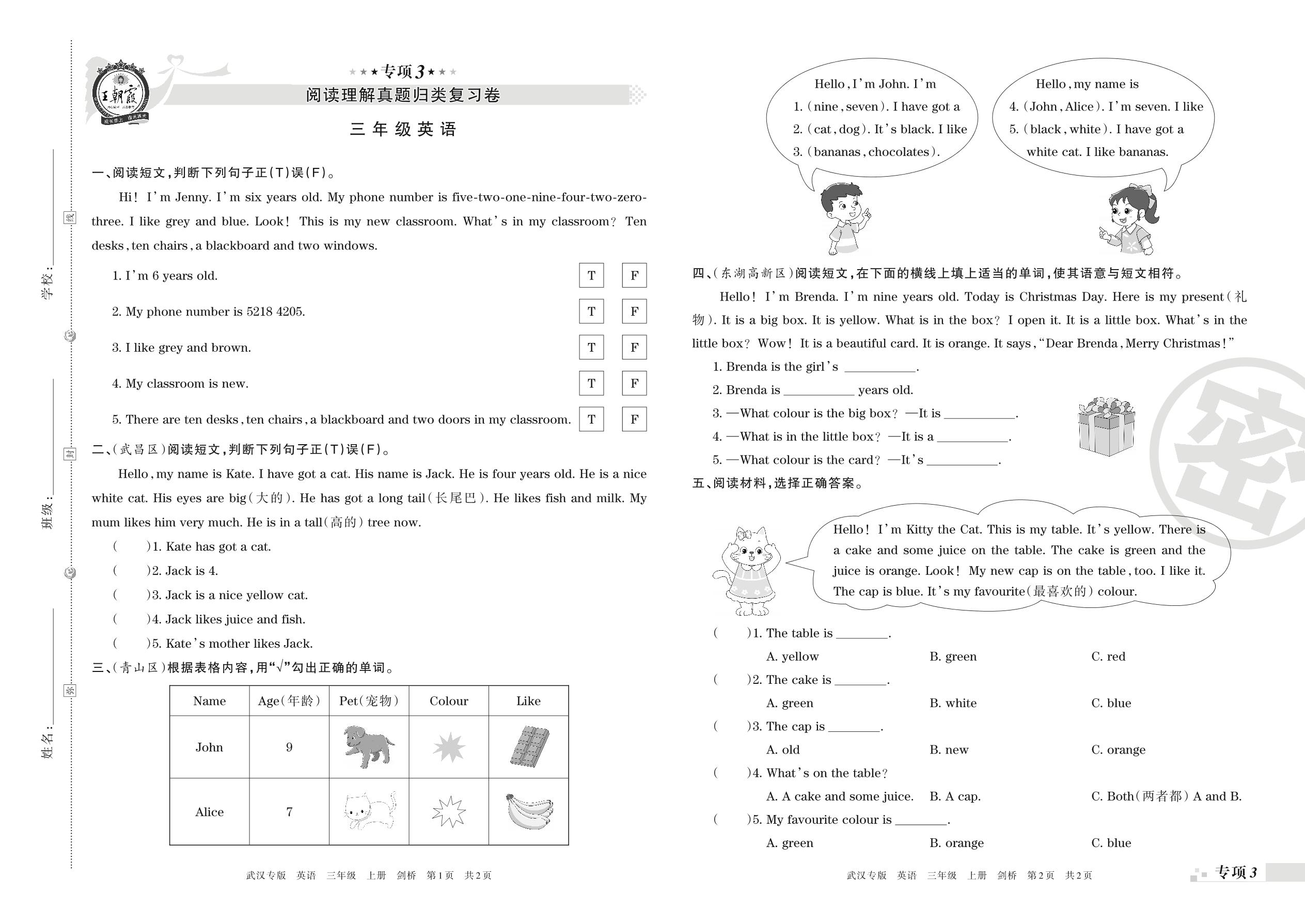 王朝霞期末专项卷——阅读理解真题归类复习卷三年级上册英语(剑桥版)【3】