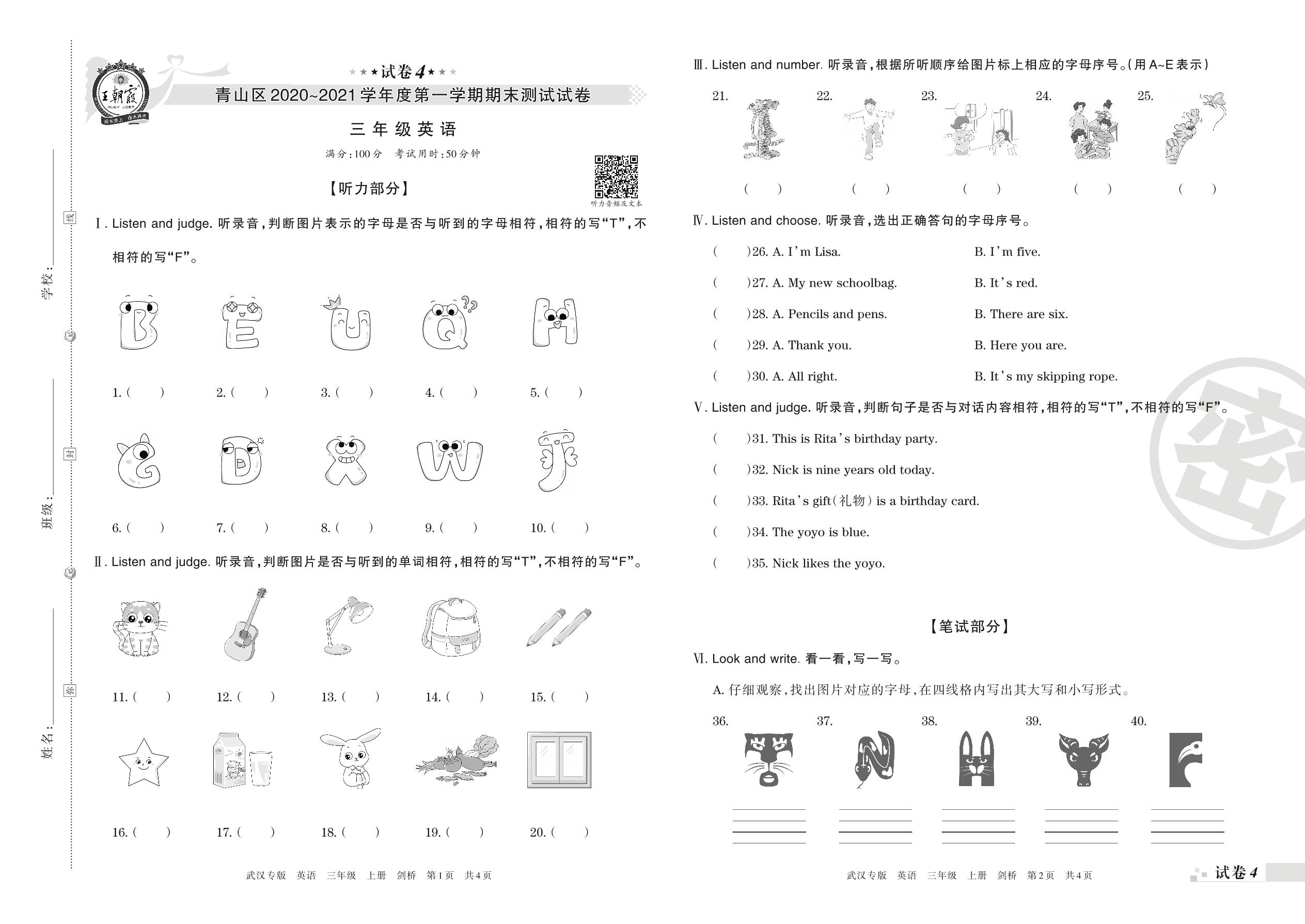 青山区2020~2021学年度第一学期期末测试试卷三年级英语(剑桥版)【4】