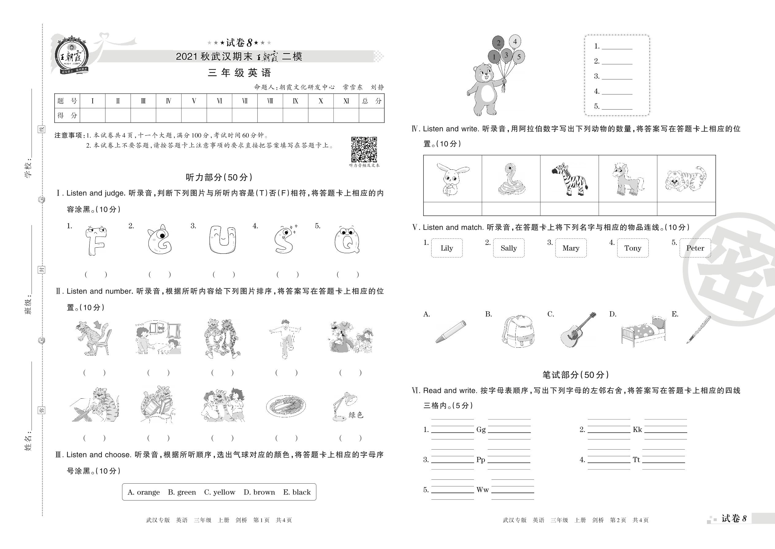 王朝霞期末模拟卷三年级上册英语(剑桥版)【8】