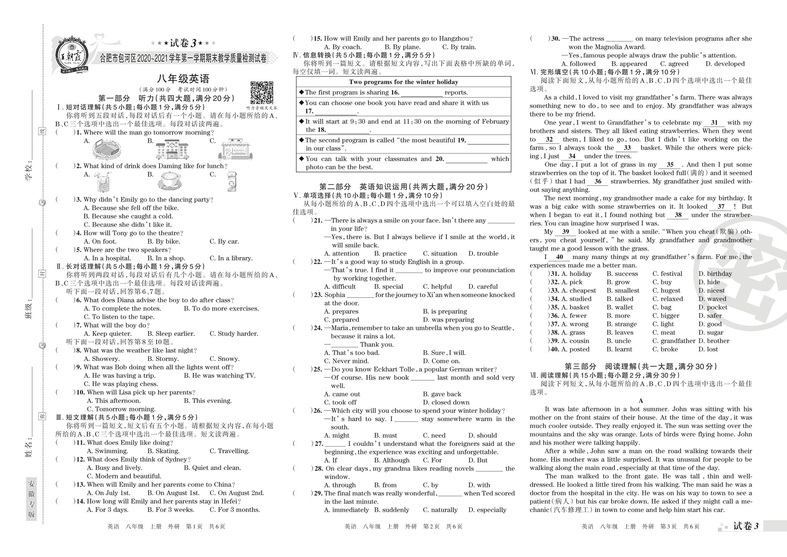 合肥市包河区2020~2021学年第一学期期末教学质量检测试卷八年级英语(外研版)【3】