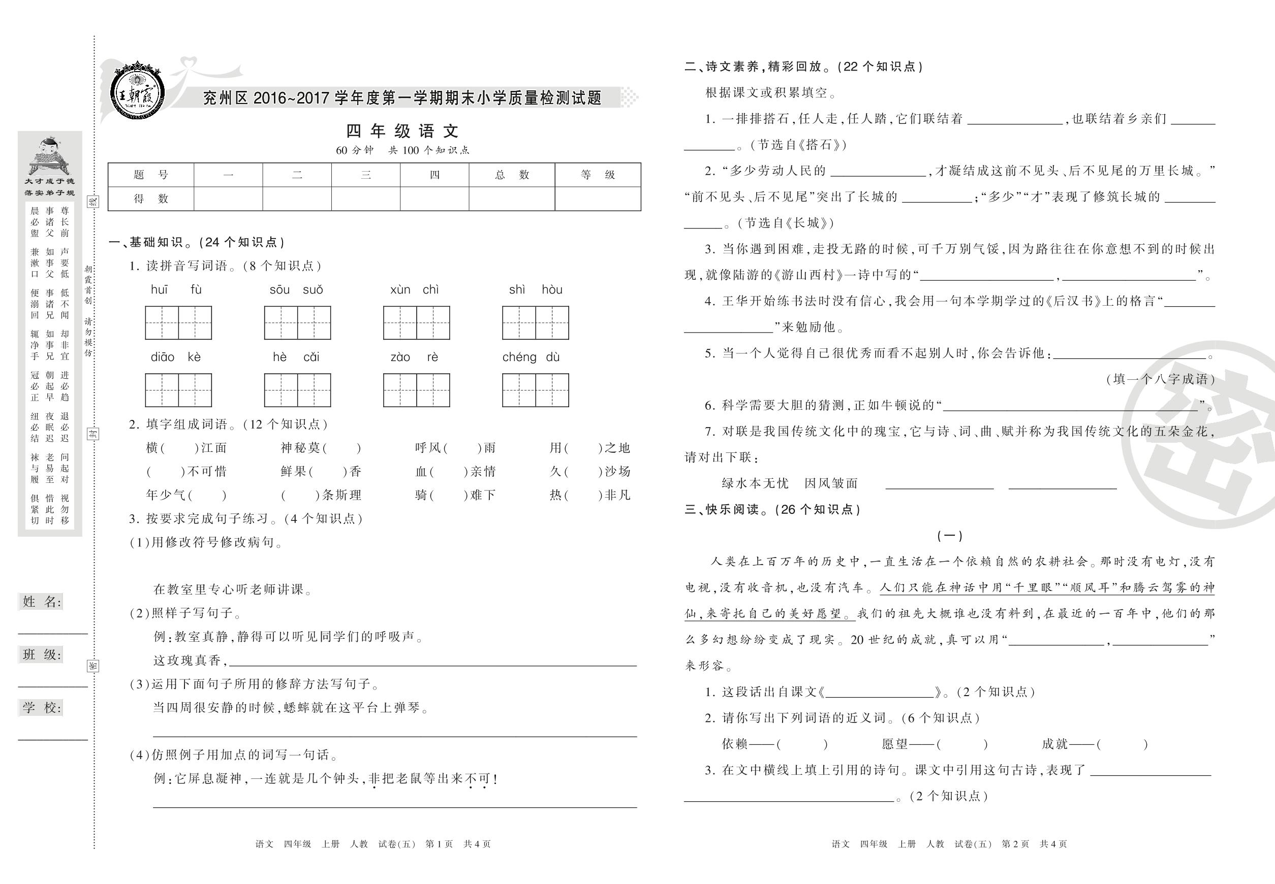 2016-2017学年第一学期济宁市兖州区四年级语文试卷(人教版)【5】
