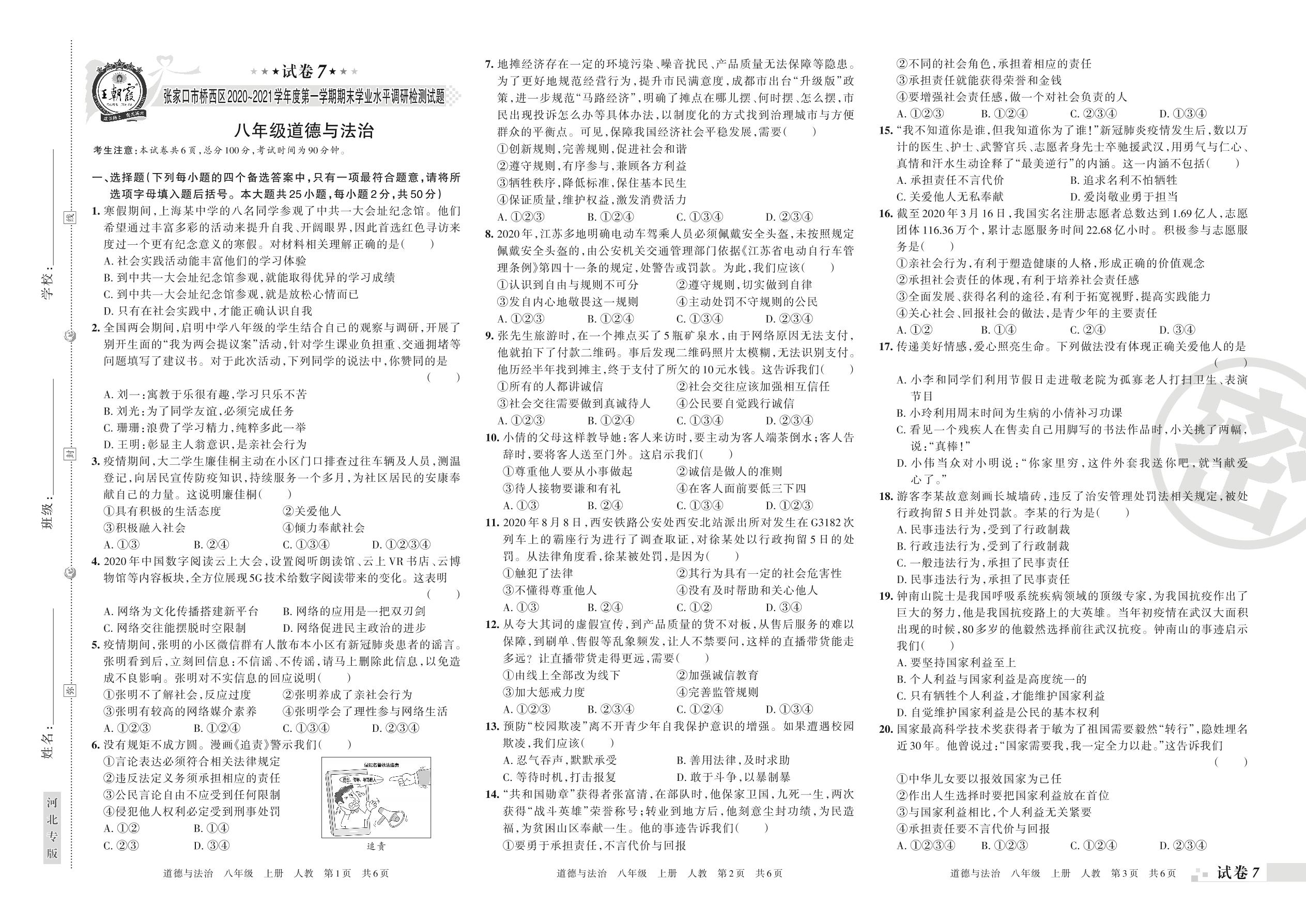 张家口市桥西区2020~2021学年度第一学期期末学业水平调研检测试题八年级道德与法治(人教版)【7】