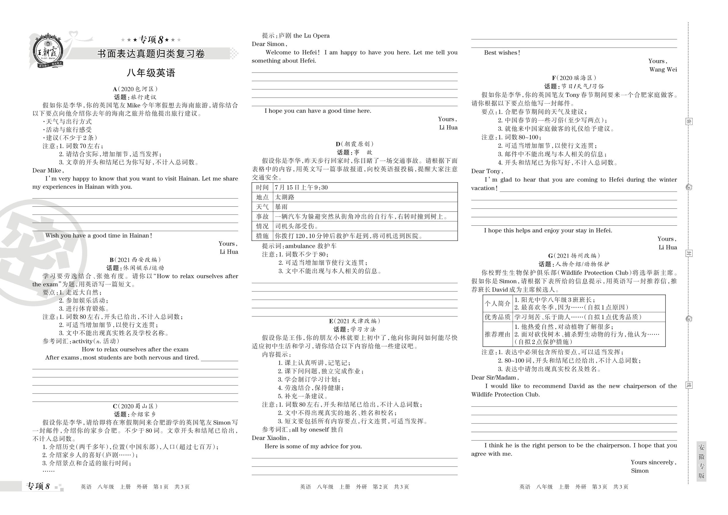 王朝霞期末专项卷——书面表达真题归类复习卷八年级上册英语(外研版)_R211223145240138【8】