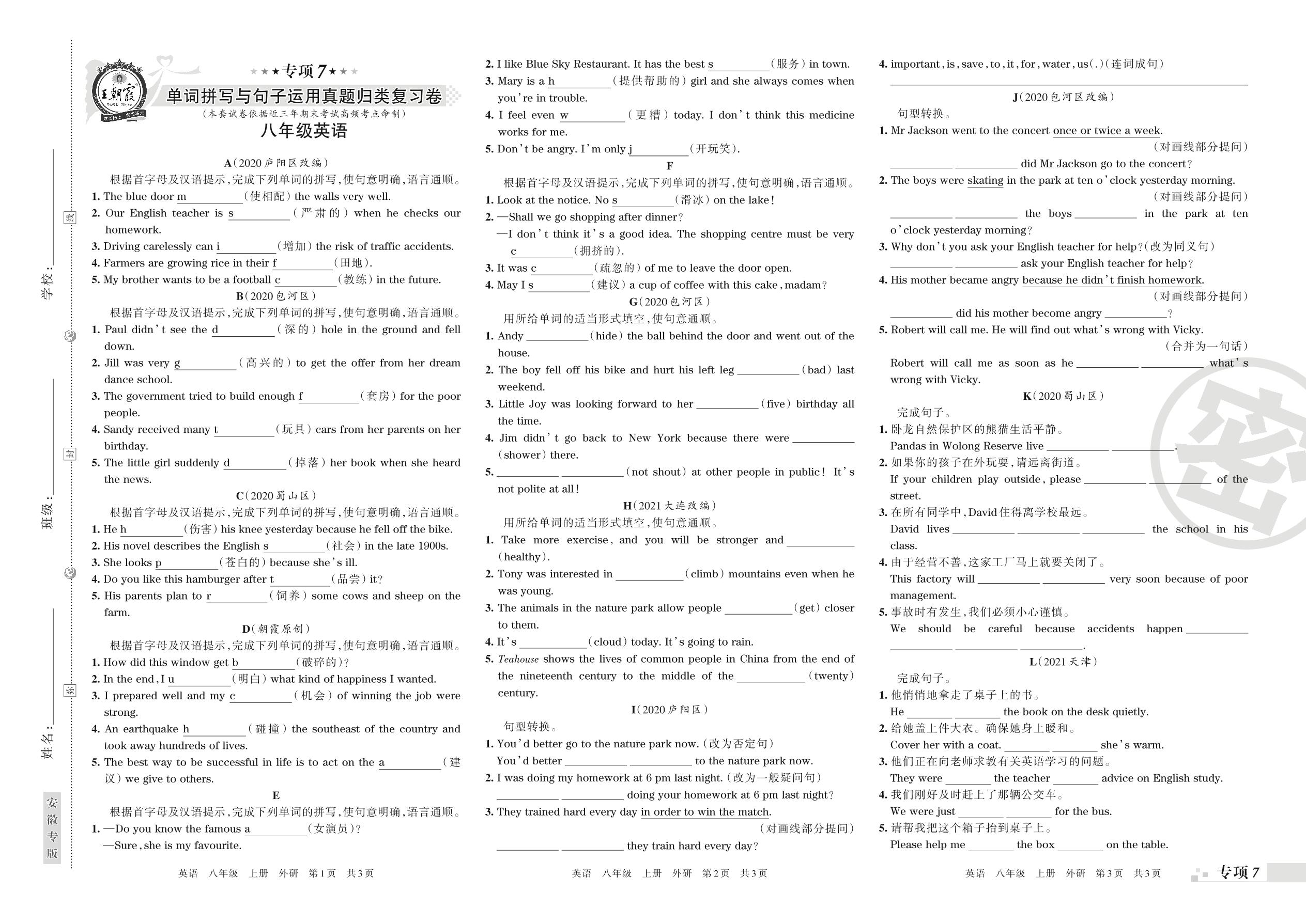 王朝霞期末专项卷——单词拼写与句子运用真题归类复习卷八年级上册英语(外研版)_R211223145240195【7】