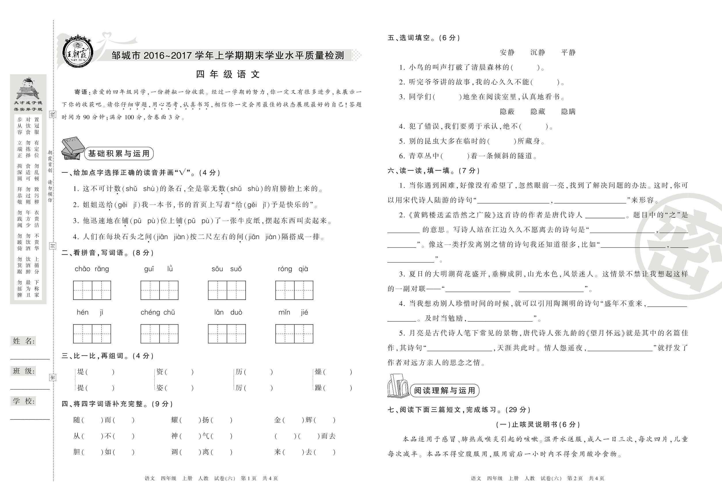 2016-2017学年第一学期邹城市四年级语文试卷(人教版)【6】